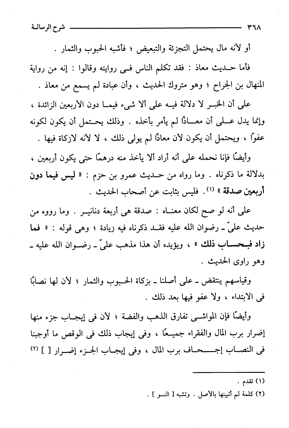 فأما حديث معاذ: فقد تكلم الناس في روايته وقالوا: إنه من رواية المنهال بن الجرح؛ وهو متروك الحديث، وأن عبادة لم يسمع من معاذ. على أن الخبر لا دلالة فيه على ألا شيء فيما دون الأربعين الزائدة، وإنما يدل على أن معاذا لم يأمر بأخذه. وذلك يحتمل أن يكون لكونه عفوا، ويحتمل أن يكون لأن معاذا لم يولي ذلك، لا لأنه لا زكاة فيها.