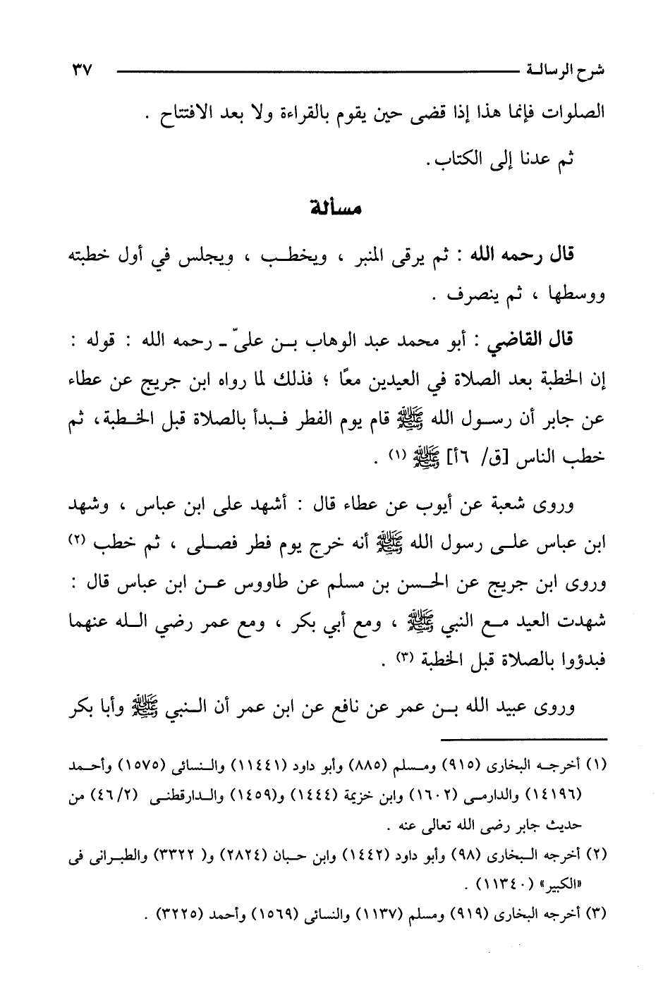 قال القاضي: أبو محمد عبد الوهاب بن علي- رحمه الله: قوله: إن الخطبة بعد الصلاة في العيدين معا؛ فذلك لما رواه ابن جريج عن عطاء عن جابر أن رسول الله صلى الله عليه وسلم قام يوم الفطر فبدأ بالصلاة قبل الخطبة، ثم خطب الناس [ق/6 أ] صلى الله عليه وسلم.
