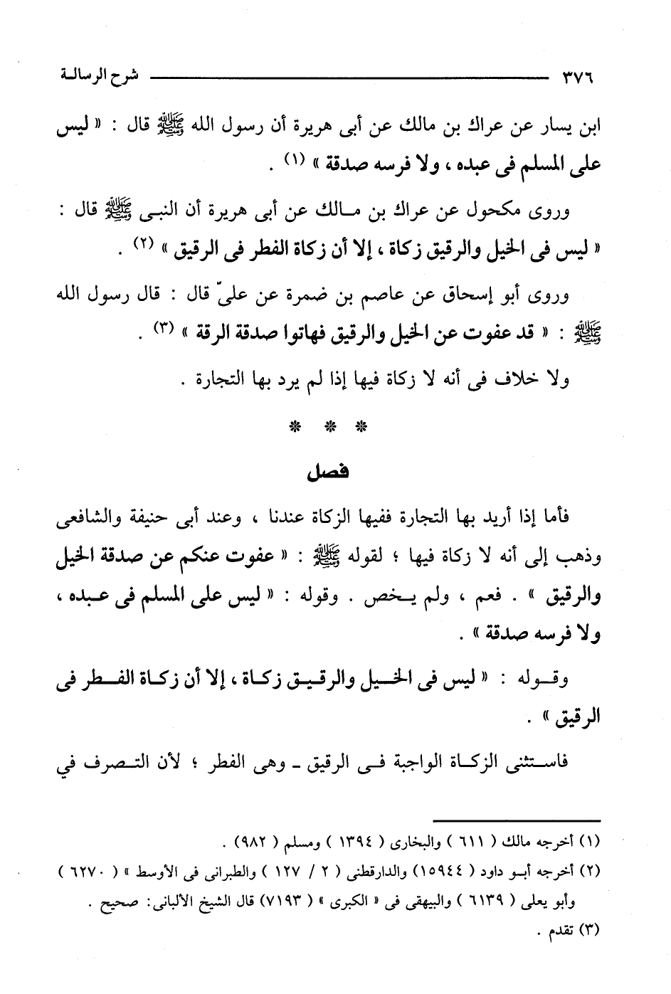 وروى مكحول عن عراك بن مالك عن أبي هريرة أن النبي صلى الله عليه وسلم قال: "ليس في الخيل والرقيق زكاة، إلا أن زكاة الفطر في الرقيق".