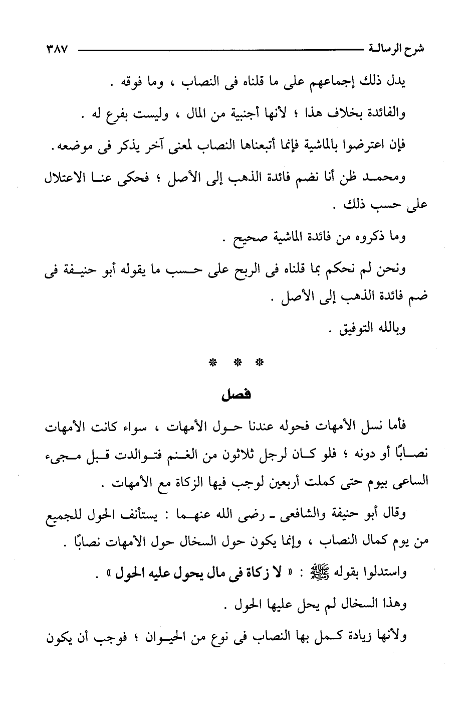 فأما نسل الأمهات فحوله عندنا حول الأمهات، سواء كانت الأمهات نصاب أو دونه؛ فلو كان لرجل ثلاثون من الغنم فتوالدت قبل مجيء الساعي بيوم حتى كملت أربعين لوجبت فيها الزكاة مع الأمهات.