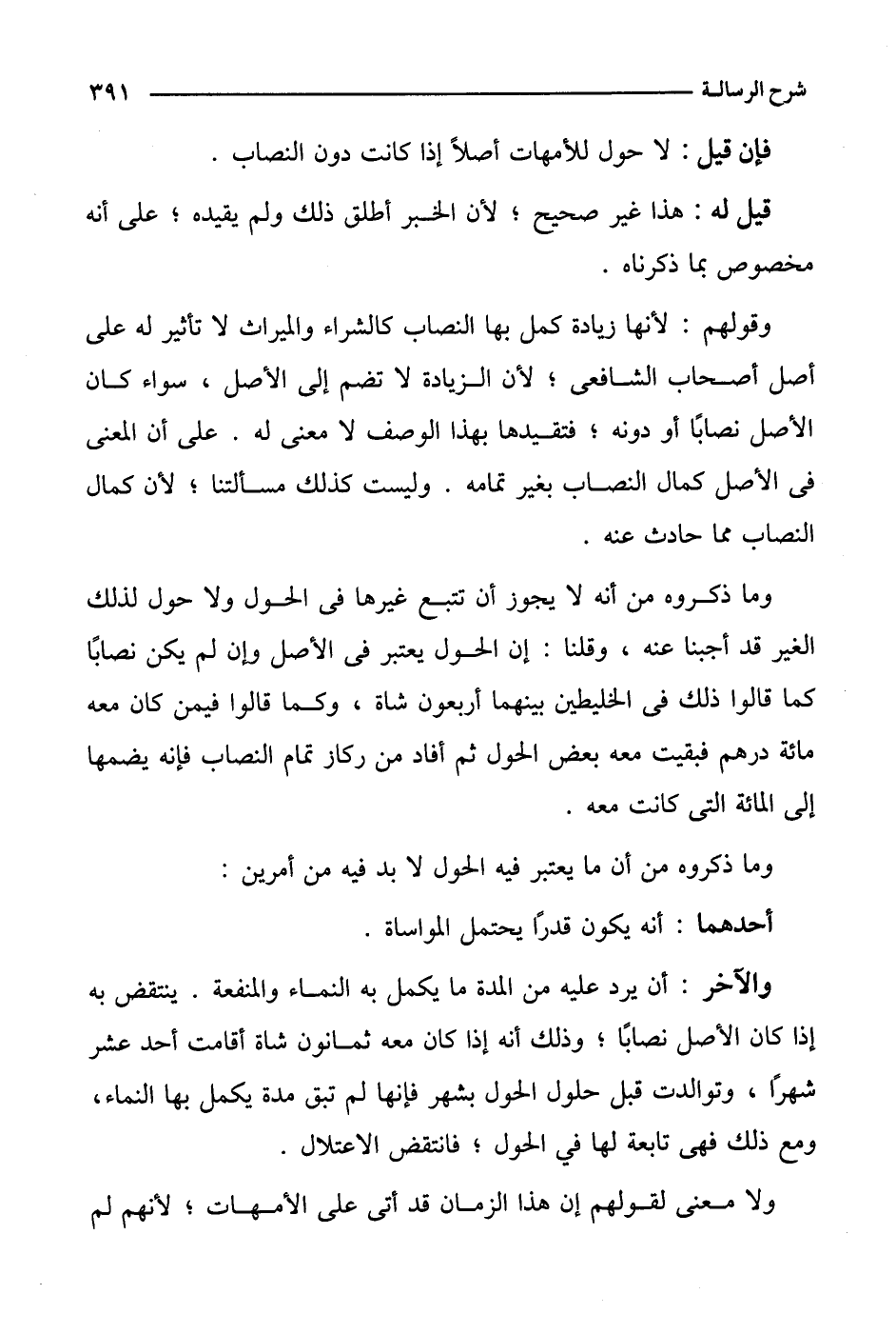 والآخر: أن يرد عليه من المدة ما يكمل به النماء والمنفعة. ينتقض به إذا كان الأصل نصاب؛ وذلك أنه إذا كان معه ثمانون شاة أقامت أحد عشر شهر، وتوالدت قبل حلول الحول بشهر فإنها لم تبق مدة يكمل بها النماء، ومع ذلك فهي تابعة لها في الحول؛ فانتقض الاعتلال.