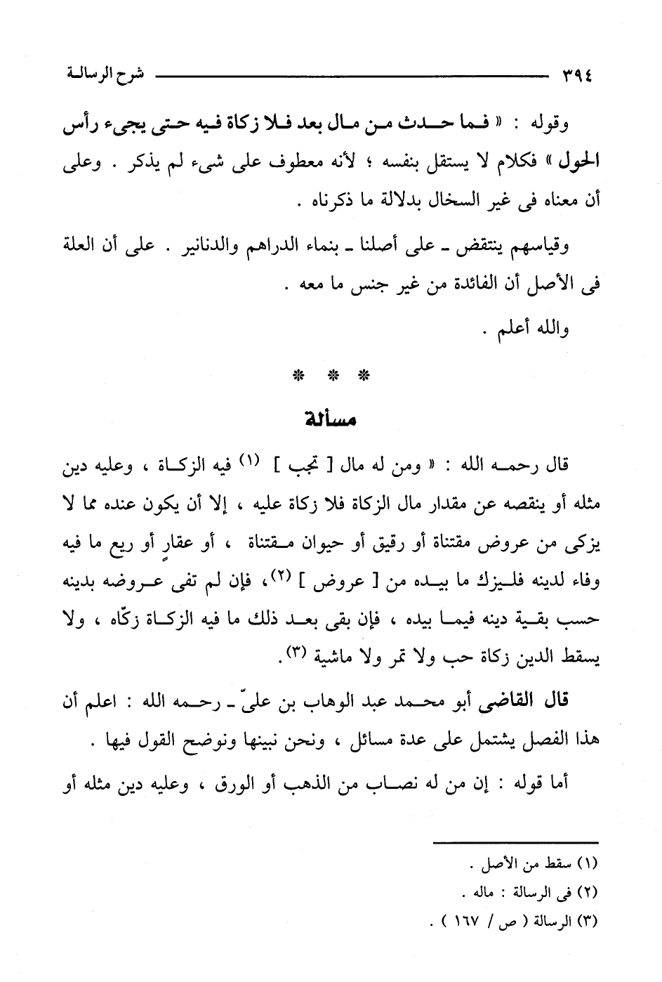 قال القاضي: أبو محمد عبد الوهاب بن علي- رحمه الله: أعلم أن هذا الفصل يشتمل على عدة مسائل، ونحن نبينها ونوضح القول فيها.