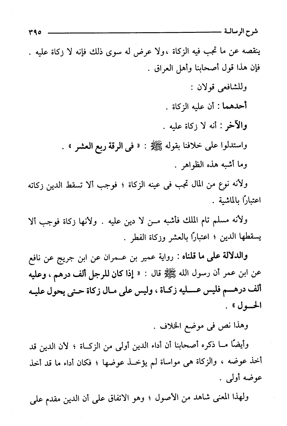 والدلالة على ما قلناه: رواية عمير بن عمران عن ابن جريج عن نافع عن ابن عمر أن رسول الله صلى الله عليه وسلم قال: "إذا كان للرجل ألف درهم، وعليه ألف درهم فليس عليه زكاة، وليس على مال زكاة حتى يحول عليه الحول".