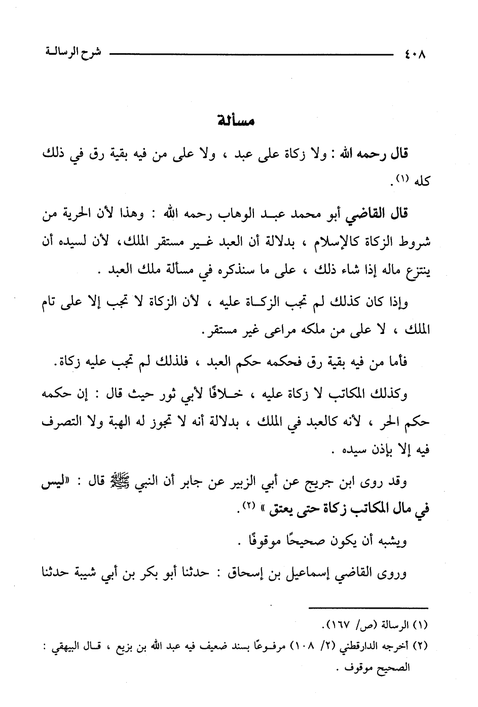 قال القاضي أبو محمد عبد الوهاب رحمه الله: وهذا لأن الحرية من شروط الزكاة كالإسلام، بدلالة أن البد غير مستقر الملك، لأن لسيده أن ينتزع ماله إذا شاء ذلك، على ما سنذكره في مسألة ملك العبد.