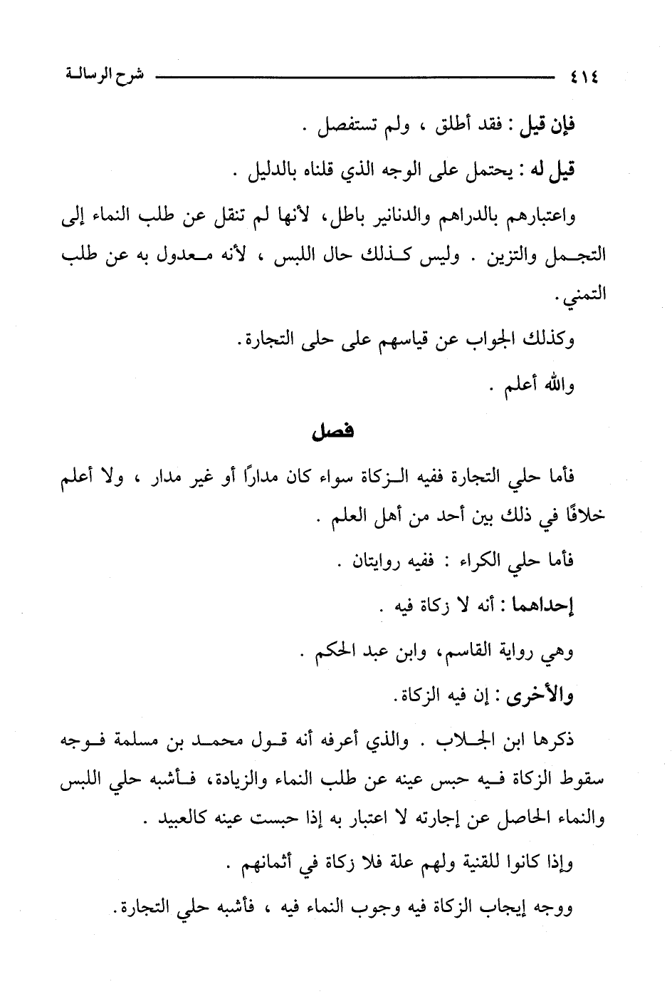 ذكرها ابن الجلاب. والذي أعرفه أنه قول محمد بن مسلمة فوجه سقوط الزكاة فيه حبس عينه عن طلب النماء والزيادة، فأشبه حلي اللبس والنماء الحاصل عن إجارته لا اعتبار به إذا حبست عينه كالعبيد.