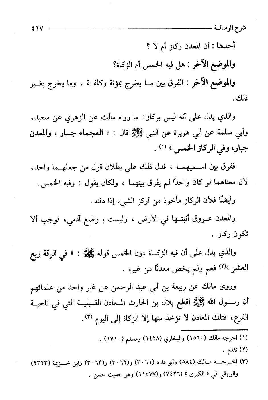 وروى مالك عن ربيعة بن أبي عبد الرحمن عن غير واحد من علمائهم أن رسول الله صلى الله عليه وسلم أقطع بلال بن الحارث المعادن القبلية التي في ناحية الفرع، فتلك المعادن لا تؤخذ منها إلا الزكاة إلى اليوم.