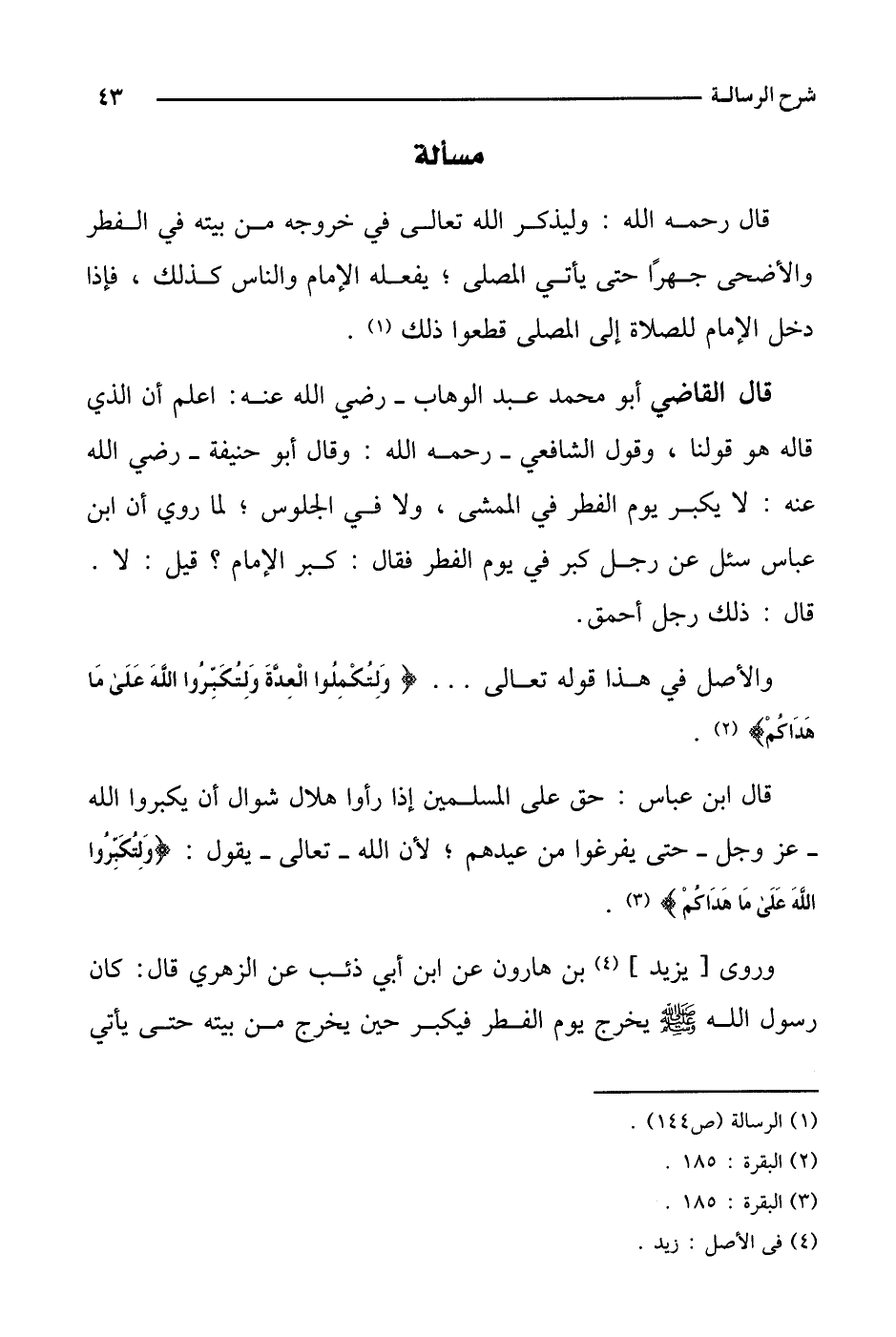 قال القاضي أبو محمد عبد الوهاب- رضي الله عنه: اعلم أن الذي قاله هو قولنا، وقول الشافعي- رحمه الله: وقال أبو حنيفة- رضي الله عنه: لا يكبر يوم الفطر في الممشى، ولا في الجلوس؛ لما روي أن ابن عباس سئل عن رجل كبر في يوم الفطر فقال: كبر الإمام؟ قيل: لا. قال: ذلك رجل أحمق.