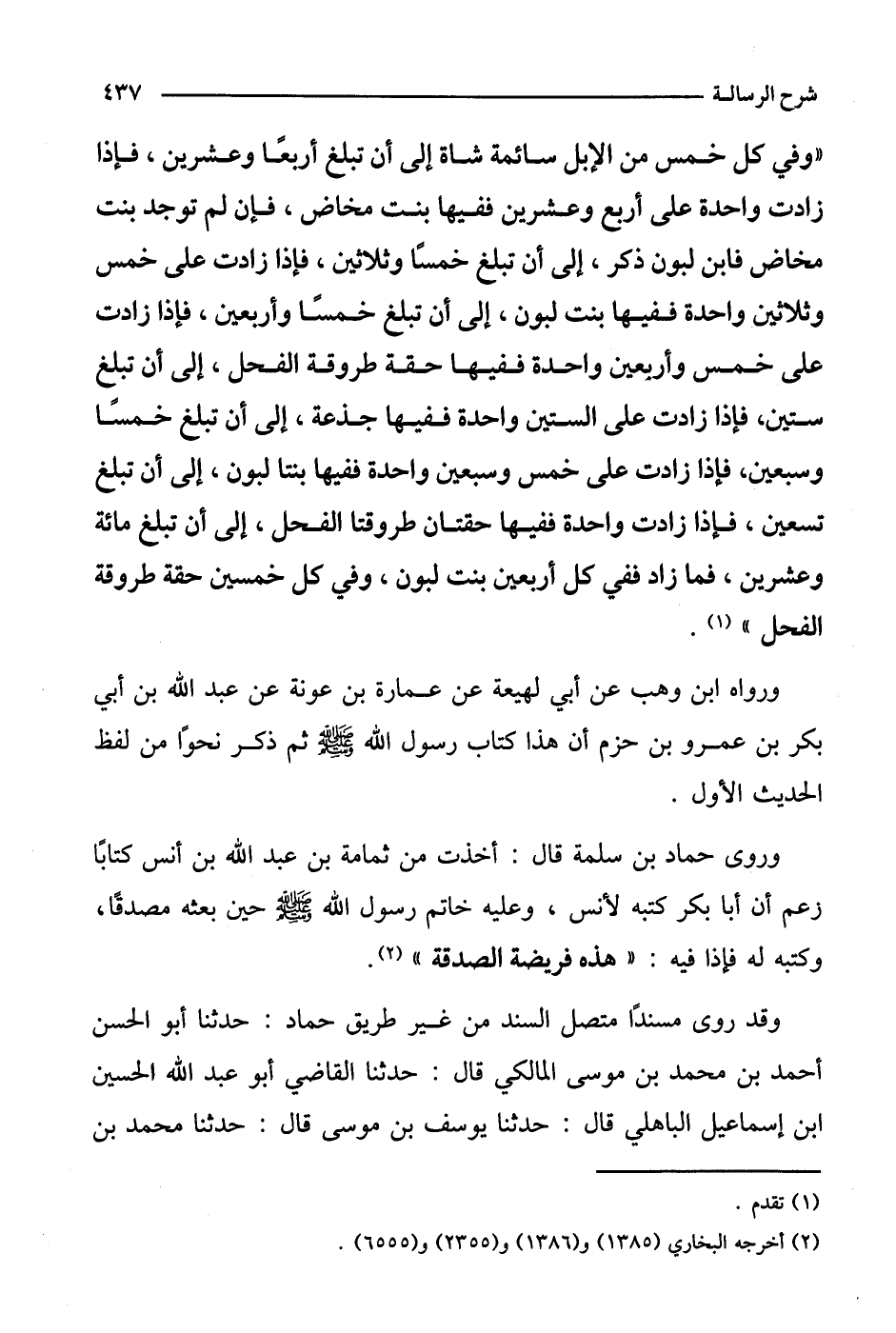 "وفي كل خمس من الإبل سائمة شاة إلى أن تبلغ أربعا وعشرين، فإذا زادت واحدة على أربع وعشرين ففيها بنت مخاض، فإن لم توجد بنت مخاض فابن لبون ذكر، إلى أن تبلغ خمسا وثلاثون، فإذا زادت على خمس وثلاثين واحدة ففيها بنت لبون، إلى أن تبلغ خمسا وأربعين، فإذا زادت على خمس وأربعين واحدة ففيها حقة طروقة الفحل، إلى أن تبلغ ستين، فإذا زادت على الستين واحدة ففيها جذعة، إلى أن تبلغ خمسا وسبعين، فإذا زادت خمس وسبعين واحدة ففيها بنتا لبون، إلى أن تبلغ تسعين، فإذا زادت واحدة ففيها حقتان طروقتا الفحل، إلى أن تبلغ مائة وعشرين، فما زاد ففي كل أربعين بنت لبون، وفي كل خمسين حقة طروقة الفحل".