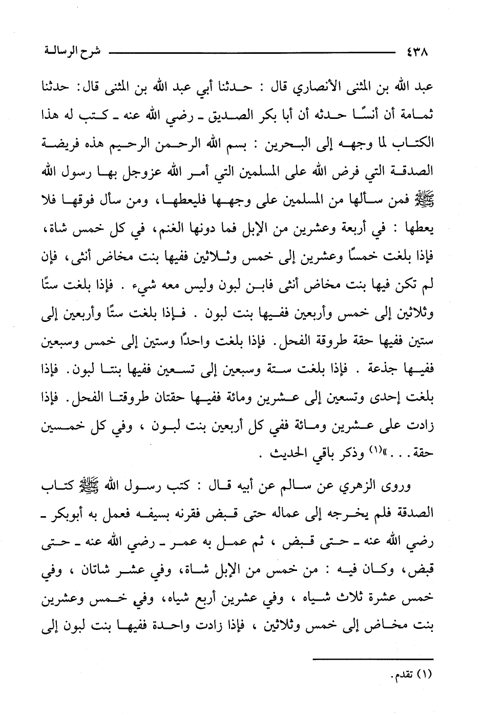 عبد الله بن المثنى الأنصاري قال: حدثنا أبي عبد الله بن المثنى قال: حدثنا ثمامة أن أنسا حدثه أن أبا بكر الصديق- رضي الله عنه- كتب له هذا الكتاب لما وجهه إلى البحرين: بسم الله الرحمن الرحيم هذه فريضة الصدقة التي فرض الله على المسلمين التي أمر الله عز وجل بها رسول الله صلى الله عليه وسلم فمن سألها من المسلمين على وجهها فليعطها، ومن سأل فوقها فلا يعطها: في أربعة وعشرين من الإبل فما دونها الغنم، في كل خمس شاة، فإذا بلغت خمسا وعشرين إلى خمس وثلاثين ففيها بنت مخاض أنثى، فإن لم تكن فيها بنت مخاض أنثى فابن لبون وليس معه شيء. فإذا بلغت ستا وثلاثين إلى خمس وأربعين ففيها بنت لبون. فإذا بلغت ستا وأربعين إلى ستين ففيها حقة طروقة الفحل. فإذا بلغت واحدا وستين إلى خمس وسبعين ففيها جذعة. فإذا بلغت ستة وسعين إلى تسعين ففيها بنتا لبون. فإذا بلغت إحدى وتسعين إلى عشرين ومائة ففيها حقتان طروقتا الفحل. فإذا زادت على عشرين ومائة ففي كل أربعين بنت لبون، وفي كل خمسين حقة ... " وذكر باقي الحديث.