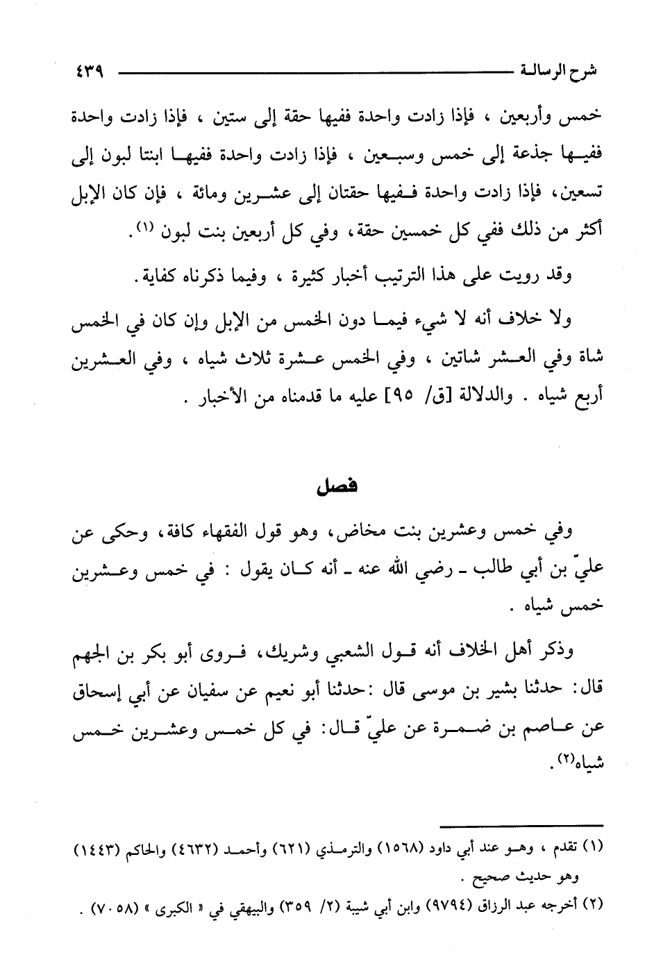 وفي خمس وعشرين بنت مخاض، وهو قول الفقهاء كافة، وحكى عن علي بن أبي طالب- رضي الله عنه- أنه كان يقول: في خمس وعشرين خمس شياه.