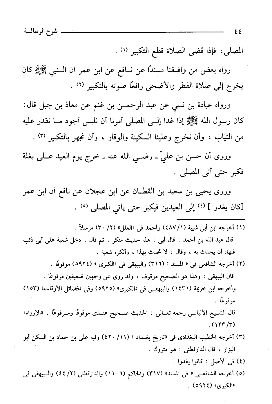 ورواه عبادة بن نسي عن عبد الرحمن بن غنم عن معاذ بن جبل قال: كان رسول الله صلى الله عليه وسلم إذا غدا إلى المصلى أمرنا أن نلبس أجود ما نقدر عليه من الثياب، وأن نخرج وعلينا السكينة والوقار، وأن نجهر بالتكبير.