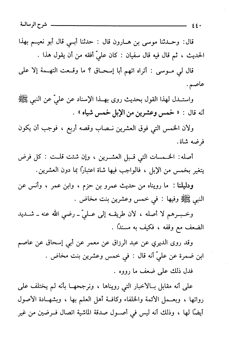 واستدل لهذا القول بحديث روى بهذا الإسناد عن علي عن النبي صلى الله عليه سلم أنه قال: "خمس وعشرين من الإبل خمس شياه".