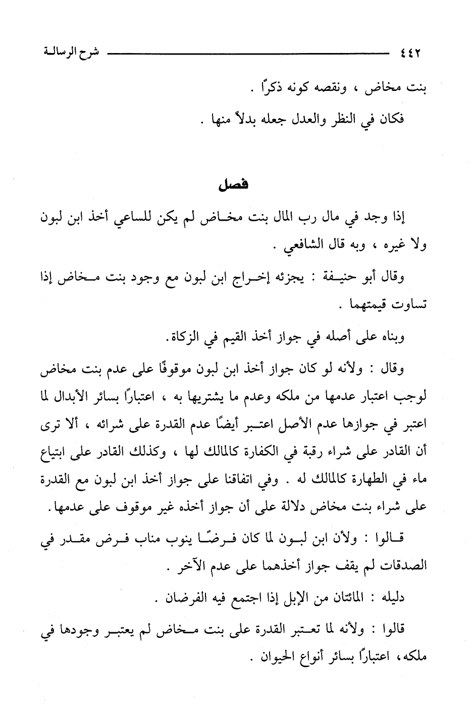 وبناه على أصله في جواز اخذ ابن لبون موقوفا على عدم بنت مخاض لوجب اعتبار عدمها من ملكه وعدم ما يشتريها به، واعتبارا بسائر الأبدال لما اعتبر في جوازها عدم الأصل اعتبر أيضا عدم القدرة على شرائه، ألا ترى أن القادر على شراء رقبة في الكفارة كالمالك لها، وكذلك القادر على ابتياع ماء في الطهارة كالمالك له. وفي اتفاقنا على جواز أخذ ابن لبون مع القدرة على شراء بنت مخاض دلالة على أن جواز أخذه غير موقوف على عدمها.