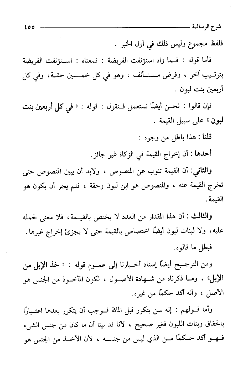 والثالث: أن هذا المقدار من العدد لا يختص بالقيمة، فلا معنى لحمله عليه، ولا لبنات لبون أيضا اختصاص بالقيمة حتى لا يجزئ إخراج غيرها.