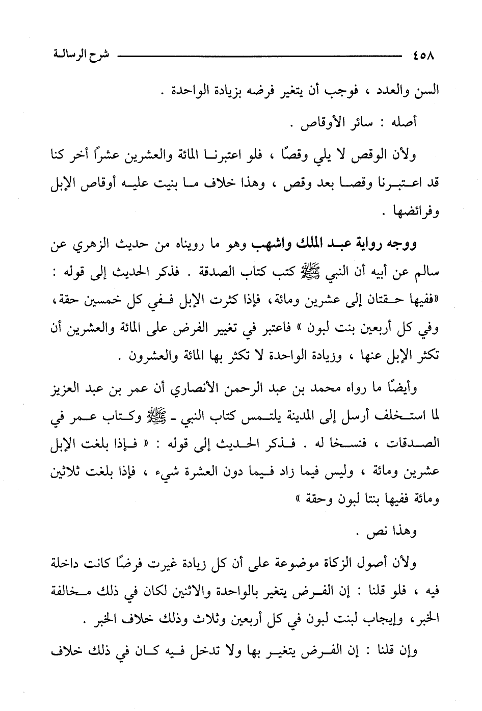 ووجه رواية عبد الملك وأشهب وهو ما رويناه من حديث الزهري عن سالم عن أبيه أن النبي صلى الله عليه وسلم كتب كتاب الصدقة. فذكر الحديث إلى قوله: "ففيها حقتان إلى عشرين ومائة، فإذا كثرت الإبل ففي كل خمسين حقة، وفي كل أربعين بنت لبون" فاعتبر في تغيير الفرض على المائة والعشرين أن تكثر الإبل عنها، وزيادة الواحدة لا تكثر بها المائة والعشرون.