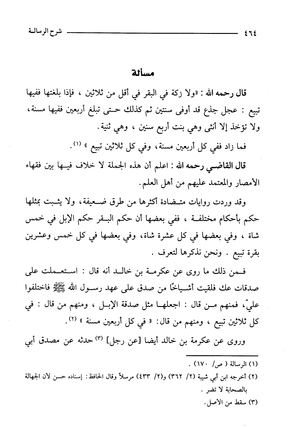 فمن ذلك ما روي عن عكرمة بن خالد أنه قال: استعملت على صدقات عك فلقيت أشياخا من صدق على عهد رسول الله صلى الله عليه وسلم فاختلفوا علي، فمنهم من قال: اجعلها مثل صدقة الإبل، ومنهم من قال: في كل ثلاثين تبيع، ومنهم من قال: "في كل أربعين مسنة".