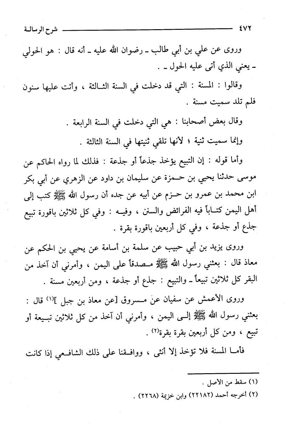 وروى يزيد بن أبي حبيب عن سلمة بن أسامة عن يحيى بن الحكم عن معاذ قال: بعثني رسول الله صلى الله عليه وسلم مصدقا على اليمن، وأمرني أن آخذ من البقر كل ثلاثين تبيعا- والتبيع: جذع أو جذعة، ومن أربعين مسنة.