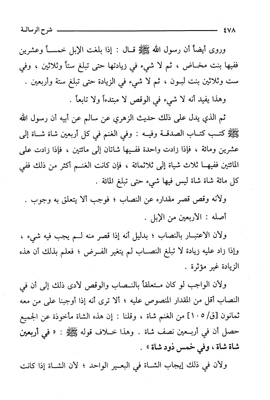 ثم الذي لا يدل على ذلك حديث الزهري عن سالم عن أبيه أن رسول الله صلى الله عليه وسلم كتب كتاب الصدقة وفيه: وفي الغنم في كل أربعين شاة شاة إلى عشرين ومائة، فإذا زادت واحدة ففيها شاتان إلى مائتين، فإذا زادت على المائتين ففيها ثلاث شياة إلى ثلاثمائة، فإن كانت الغنم أكثر من ذلك ففي كل مائة شاة شاة ليس فيها شيء حتى تبلغ المائة.