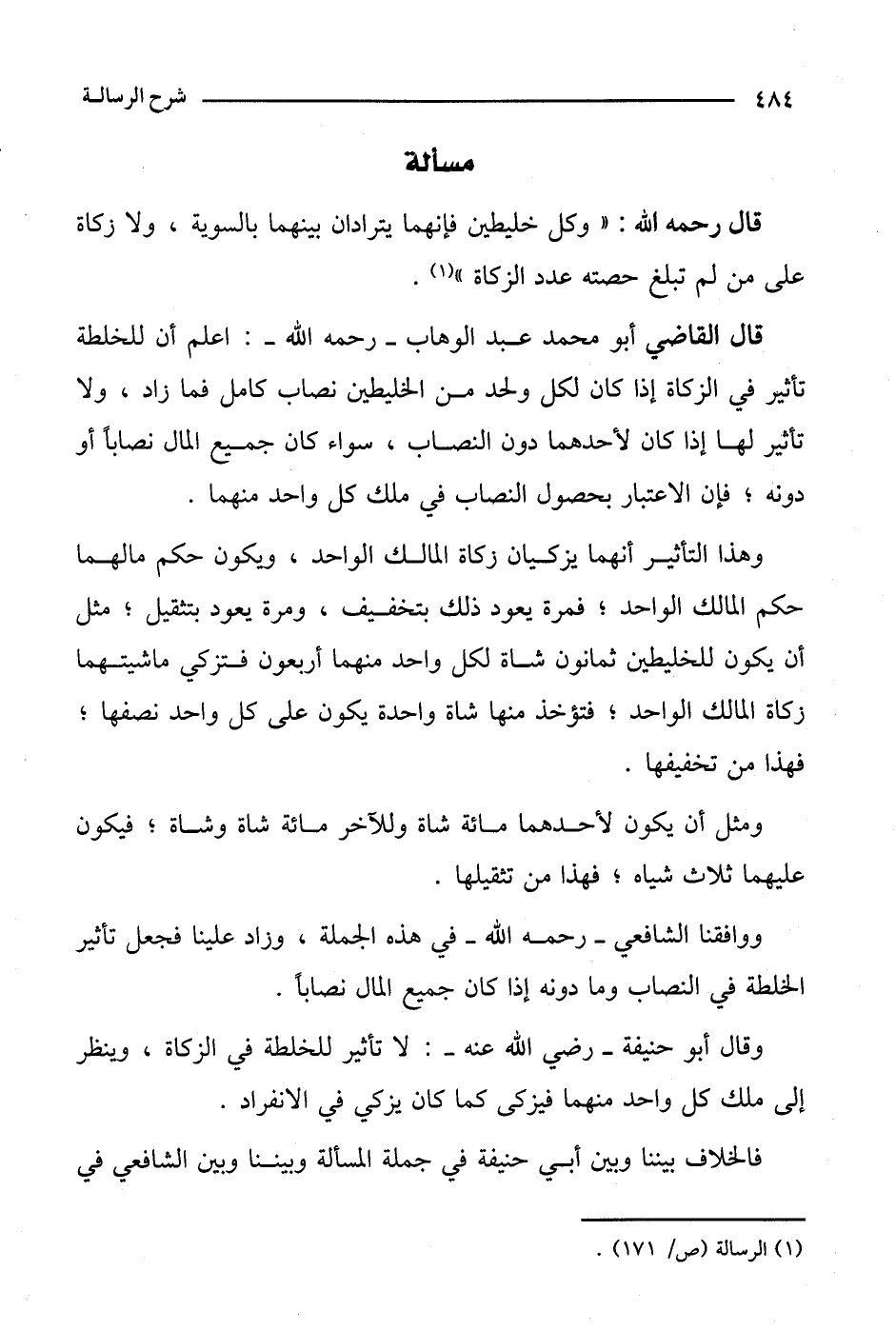 قال القاضي أبو محمد عبد الوهاب- رحمه الله-: أعلم أن للخلطة تأثير في الزكاة إذا كان لكل واحد من الخليطين نصاب كامل فما زاد، ولا تأثير لها إذا كان لأحدهما دون النصاب، سواء كان جميع المال نصابا أو دونه؛ فإن الاعتبار بحصول النصاب في ملك كل واحد منهما.