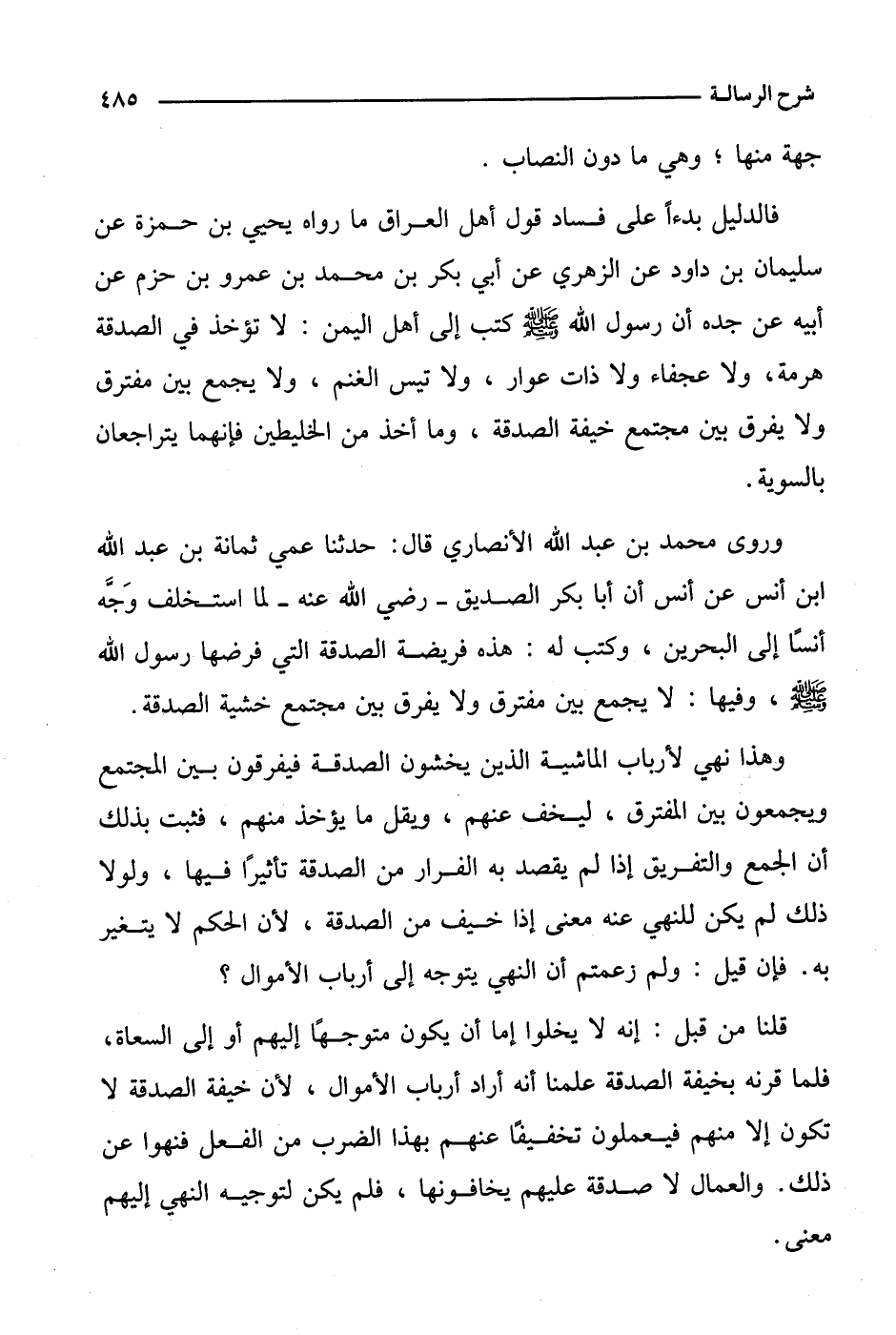 وروى محمد بن عبد الله الأنصاري قال: حدثنا عمي ثمانة بن عبد الله ابن أنس أن أبا بكر الصديق- رضي الله عنه- لما استخلف وجه أنسا إلى البحرين، وكتب له: هذه فريضة الصدقة التي فرضها رسول الله صلى الله عليه وسلم، وفيها: لا يجمع بين مفترق ولا يقرق بين مجتمع خشية الصدقة.