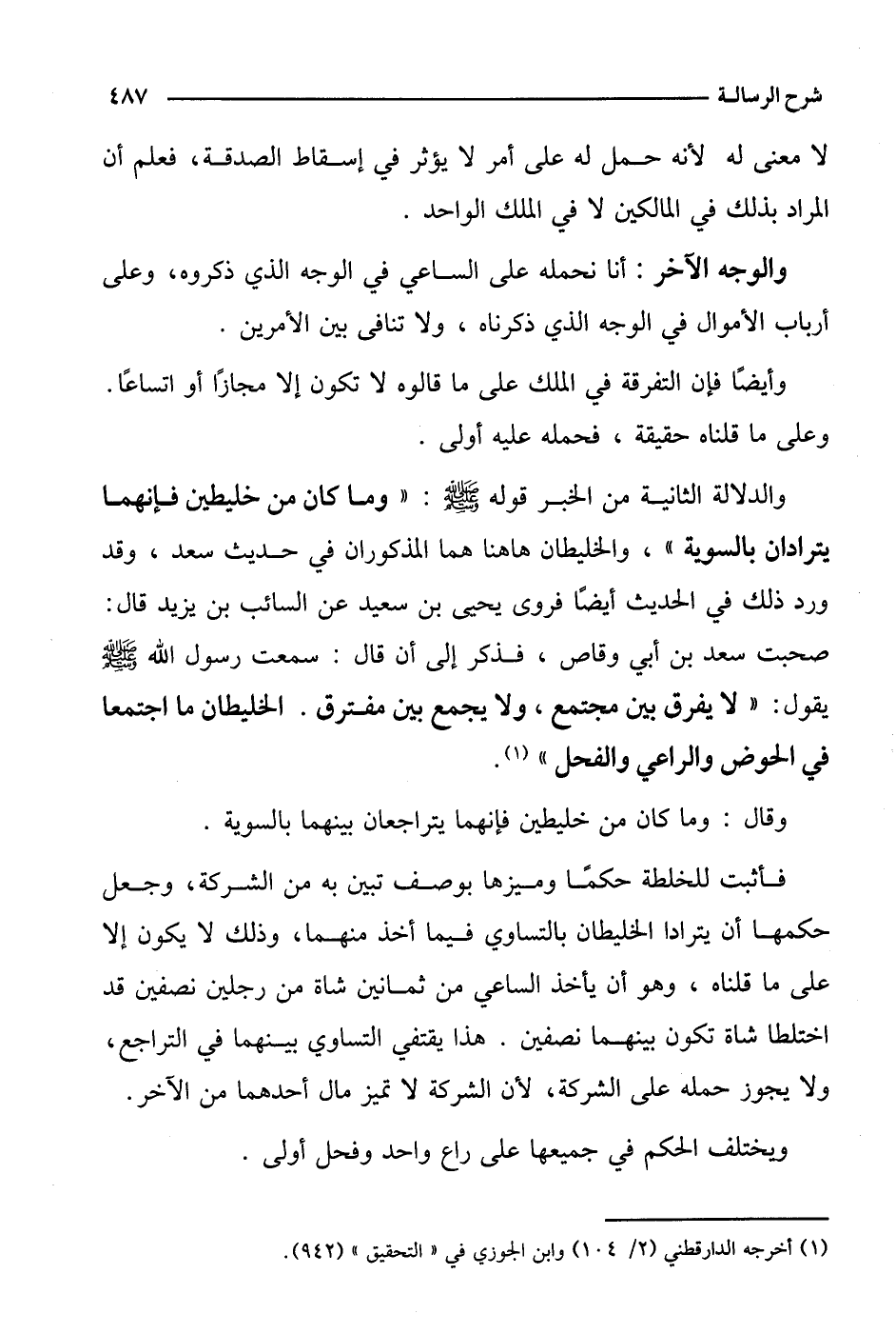والدلالة الثانية من الخبر قوله صلى الله عليه وسلم: "وما كان من خليطين فإنهما يترادان بالسوية"، والخليطان ها هنا هما المذكوران في حديث سعد، وقد ورد ذلك في الحديث أيضا فروى يحيى بن سعيد عن السائب بن يزيد قال: صحبت سعد بن أبي وقاص، فذكر إلى أن قال: سمعت رسول الله صلى الله عليه وسلم يقول: "لا يفرق بين مجتمع، ولا يجمع بين مفترق. الخليطان ما اجتمعا في الحوض والراعي والفحل".