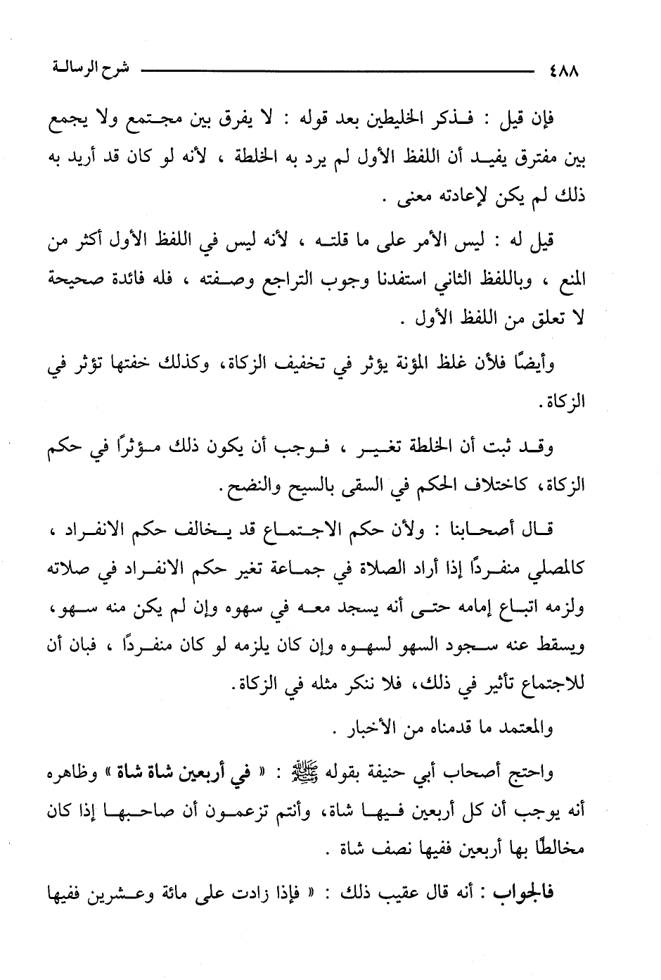 واحتج أصحاب أبي حنيفة بقوله صلى الله عليه وسلم: "في أربعين شاة شاة" وظاهره أنه يوجب أن كل أربعين فيها شاة، وأنتم تزعمون أن صاحبها إذا كان مخالطا بها أربعين ففيها نصف شاة.