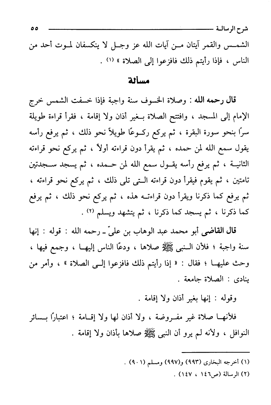 قال رحمه الله: وصلاة الخسوف سنة واجبة فإذا خسفت الشمس خرج الإمام إلى المسجد، وافتتح الصلاة بغير أذان ولا إقامة، فقرأ قراءة طويلة سرا بنحو سورة البقرة، ثم يركع ركوعا طويلا نحو ذلك، ثم يرفع رأسه يقول سمع الله لمن حمده، ثم يقرأ دون قراءته أولا، ثم يركع نحو قراءته الثانية، ثم يرفع رأسه يقول سمع الله لمن حمده، ثم يسجد سجدتين تامتين، ثم يقوم فيقرأ دون قراءته التي تلي ذلك، ثم يركع نحو قراءته، ثم يرفع كما ذكرنا ويقرأ دون قراءته هذه، ثم يركع نحو ذلك، ثم يرفع كما ذكرنا، ثم يسجد كما ذكرنا، ثم يتشهد ويسلم.