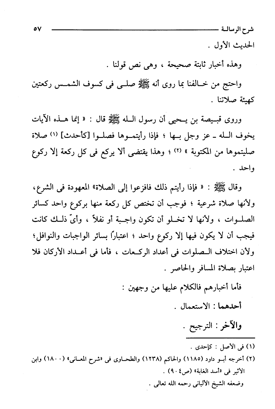 وقال صلى الله عليه وسلم: "فإذا رأيتم ذلك فافزعوا إلى الصلاة" المعهودة في الشرع، ولأنها صلاة شرعية؛ فوجب أن تختص كل ركعة منها بركوع واحد كسائر الصلوات، ولأنها لا تخلو أن تكون واجبة أو نفلا، وأي ذلك كانت فيجب أن لا يكون فيها إلا ركوع واحد؛ اعتبارا بسائر الواجبات والنوافل؛ ولأن اختلاف الصلوات في أعداد الركعات، فأما في أعداد الأركان فلا اعتبار بصلاة المسافر والحاصر.