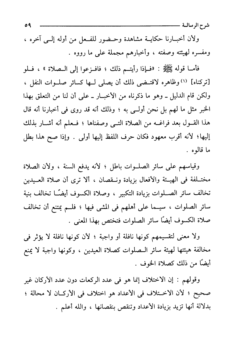 وقوله: إن الاختلاف إنما هو في عدد الركعات دون عدد الأركان غير صحيح؛ لأن الاختلاف في الأعداد هو اختلاف في الأركان لا محالة؛ بدلالة أنها تزيد بزيادة الأعداد وتنقص بنقصانها، والله أعلم.