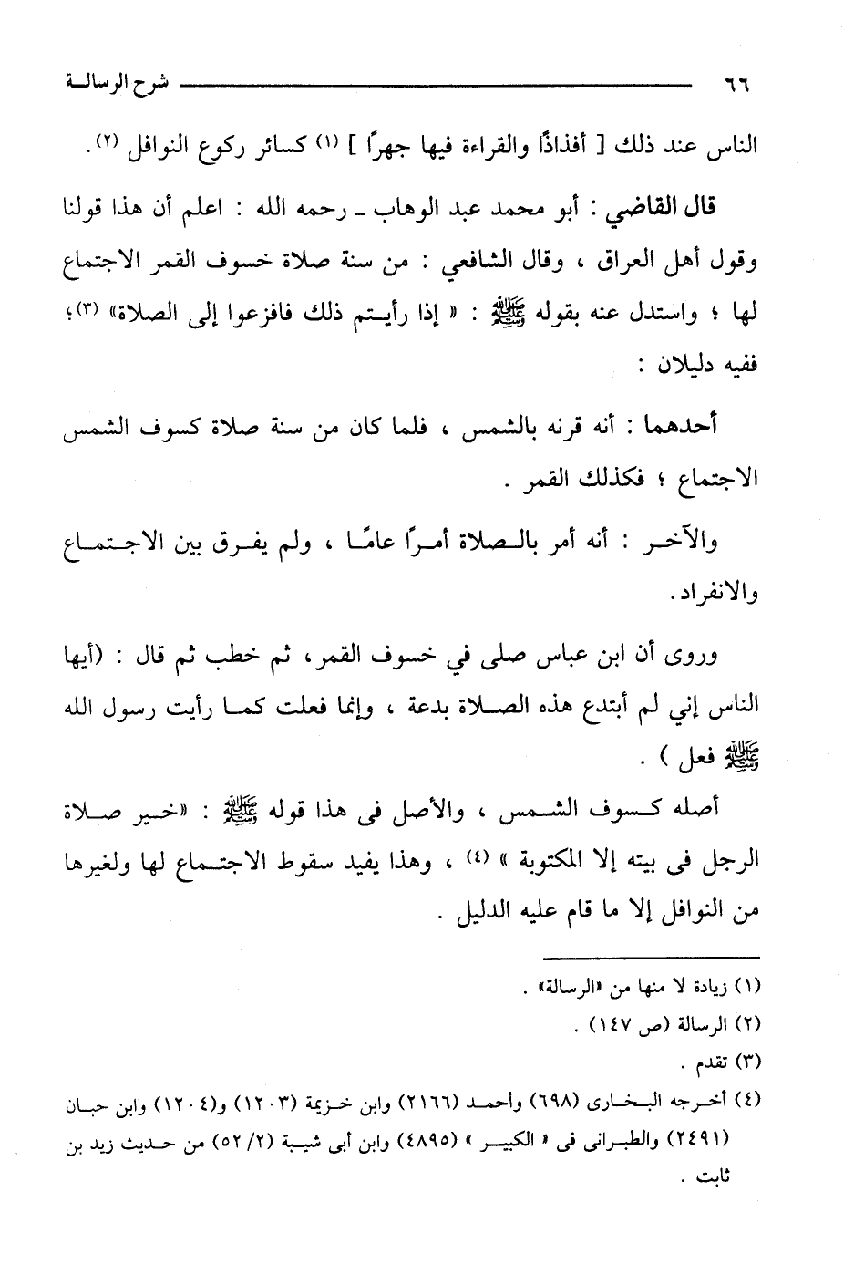 قال القاضي: أبو محمد عبد الوهاب- رحمه الله: اعلم أن هذا قولنا وقول أهل العراق، وقال الشافعي: من سنة صلاة خسوف القمر الاجتماع لها؛ واستدل عنه بقوله صلى الله عليه وسلم: "إذا رأيتم ذلك فافزعوا إلى الصلاة"؛ ففيه دليلان: