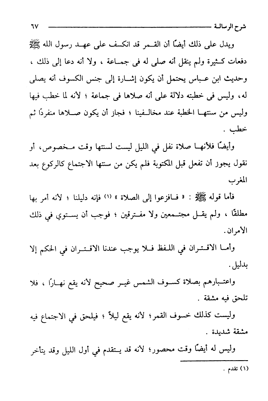 ويدل على ذلك أيضا أن القمر قد انكسف على عهد رسول الله صلى الله عليه وسلم دفعات كثيرة ولم ينقل أنه صلى له في جماعة، ولا أنه دعا إلى ذلك، وحديث ابن عباس يحتمل أن يكون إشارة جنس الكسوف أنه يصلى له، وليس في خطبته دلالة على أنه صلاها في جماعة؛ لأنه لما خطب فيها وليس من سنتها الخطبة عند مخالفينا؛ فجاز أن يكون صلاها منفردا ثم خطب.