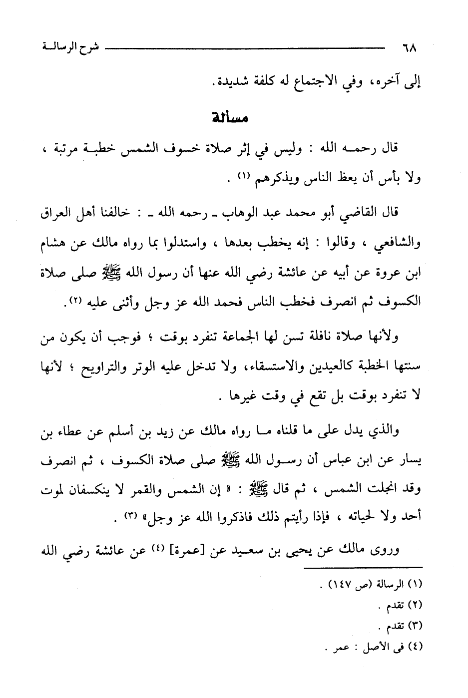 قال القاضي أبو محمد عبد الوهاب- رحمه الله: خالفنا أهل العراق والشافعي، وقالوا: إنه يخطب بعدها، واستدلوا بما رواه مالك عن هشام ابن عروة عن أبيه عن عائشة رضي الله عنها أن رسول الله صلى الله عليه وسلم صلى صلاة الكسوف ثم انصرف فخطب الناس فحمد الله عز وجل وأثنى عليه.