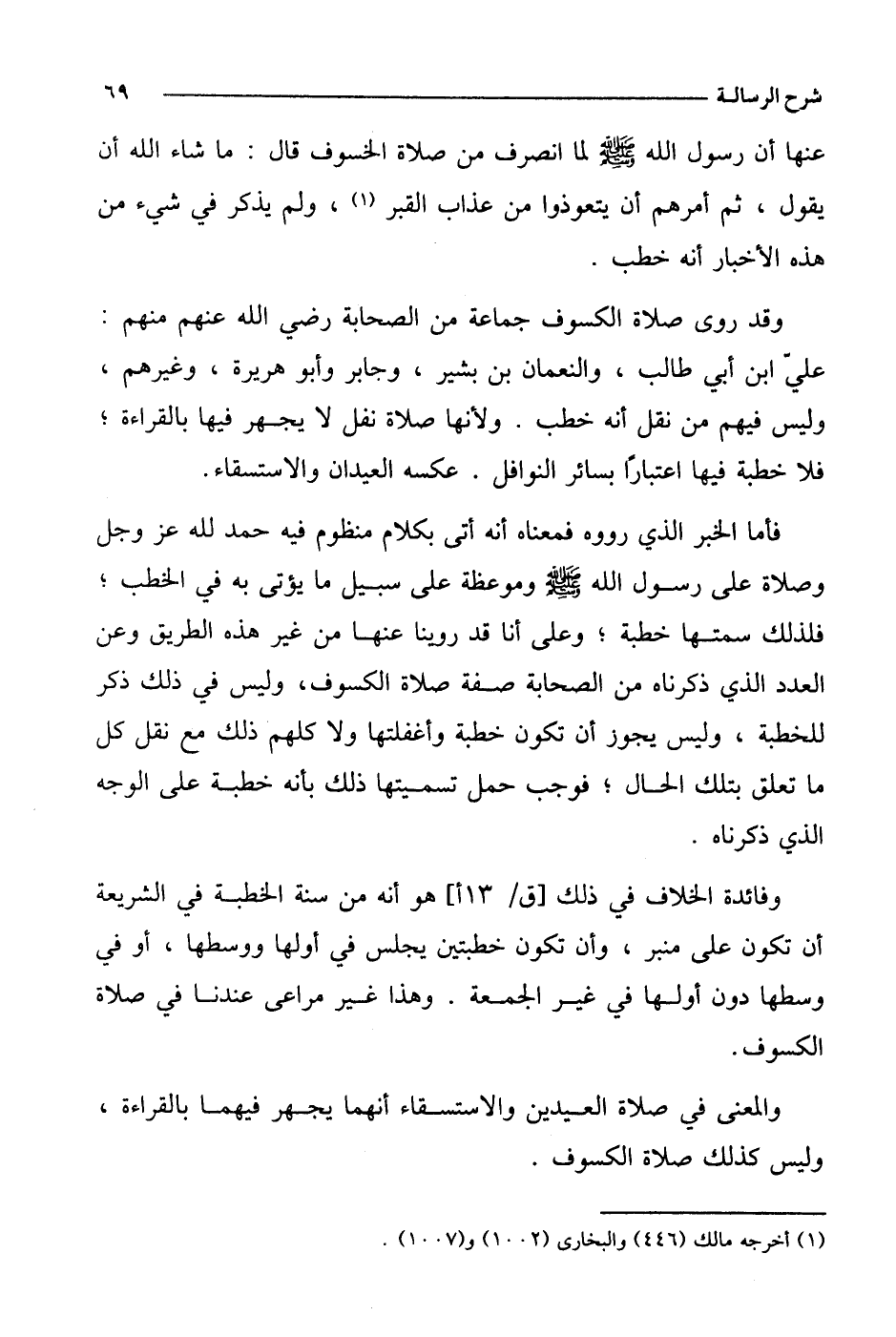 وفائدة الخلاف في ذلك [ق/13 أ] هو أنه من سنة الخطبة في الشريعة أن تكون على منبر، وأن تكون خطبتين يجلس في أولها ووسطها، أو في وسطها دون أولها في غير الجمعة. وهذا غير مراعى عندنا في صلاة الكسوف.