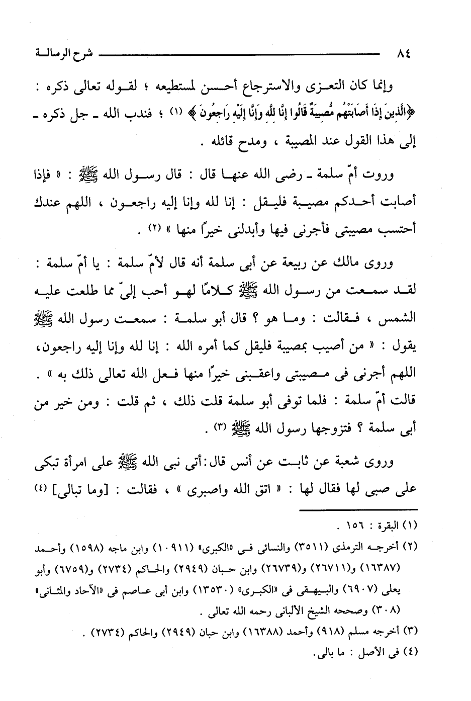 وإنما كان التعزي والاسترجاع أحسن لمستطيعه؛ لقوله تعالى ذكره: {الذين إذا أصابتهم مصيبة قالوا إنا لله وإنا إليه راجعون}؛ فندب الله- جل ذكره- إلى هذا القول عند المصيبة، ومدح قائله.