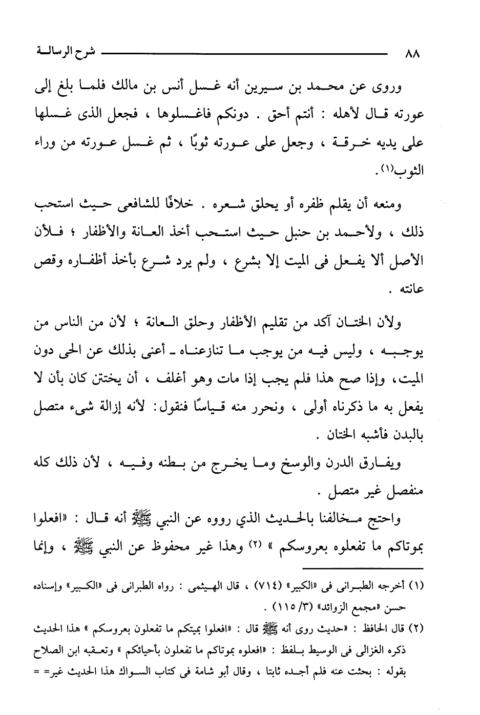 ومنعه أن يقلم ظفره أو يحلق شعره. خلافا للشافعي حيث استحب ذلك، ولأحمد بن حنبل حيث استحب أخذ العانة والأظفار؛ فلأن الأصل ألا يفعل في الميت إلا بشرع، ولم يرد شرع بأخذ أظفاره وقص عانته.