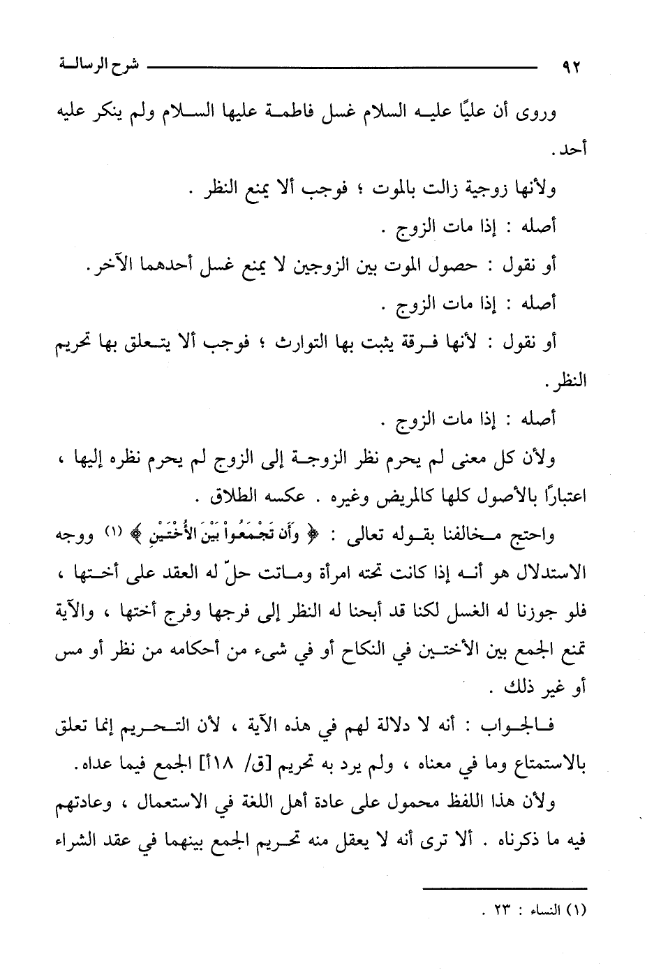 فالجواب: أنه لا دلالة لهم في هذه الآية، لأن التحريم إنما تعلق بالاستمتاع وما في معناه، ولم يرد به تحريم [ق/18 أ] الجمع فيما عداه.
