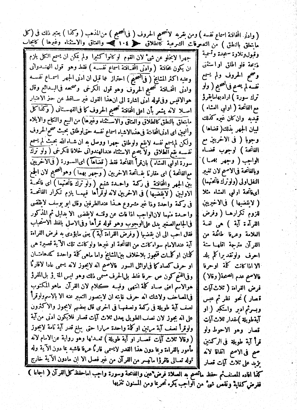 (وَكَذَا كُلُّ مَا يَتَعَلَّقُ بِالنُّطْقِ كَالطَّلَاقِ وَالْعَتَاقِ وَالِاسْتِثْنَاءِ وَغَيْرِهَا) مِنْ الْبَيْعِ وَالنِّكَاحِ وَالْإِيلَاءِ وَالْيَمِينِ أَيْ أَدْنَى الْمُخَافَتَةِ فِي هَذِهِ الْأَشْيَاءِ إسْمَاعُ نَفْسِهِ حَتَّى لَوْ طَلَّقَ بِحَيْثُ صَحَّحَ الْحُرُوفَ، وَلَكِنْ لَمْ يُسْمِعْ نَفْسَهُ لَا يَقَعُ، وَلَوْ طَلَّقَ جَهْرًا وَوَصَلَ بِهِ إنْ شَاءَ اللَّهُ بِحَيْثُ لَمْ يُسْمِعْ نَفْسَهُ يَقَعُ الطَّلَاقُ وَلَا يَصِحُّ الِاسْتِثْنَاءُ عَنْ الْهِنْدُوَانِيِّ خِلَافًا لِلْكَرْخِيِّ.