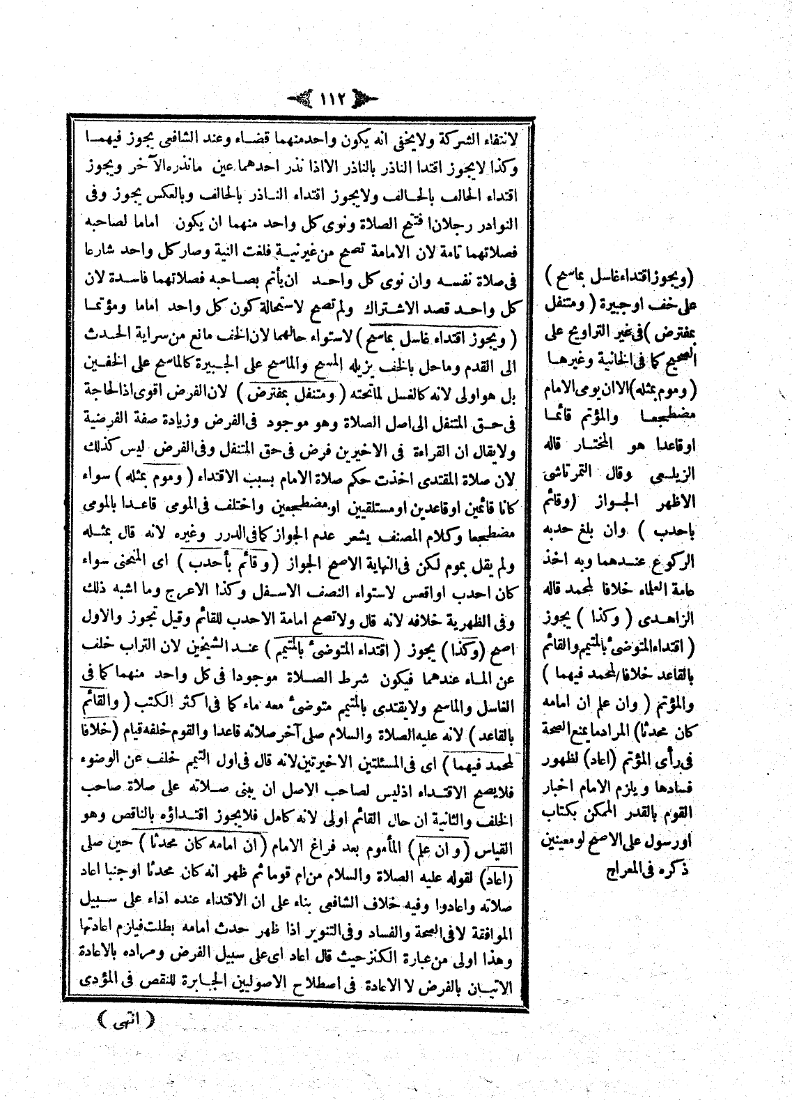 (وَمُتَنَفِّلٍ بِمُفْتَرِضٍ) ؛ لِأَنَّ الْفَرْضَ أَقْوَى؛ إذْ الْحَاجَةُ فِي حَقِّ الْمُتَنَفِّلِ إلَى أَصْلِ الصَّلَاةِ وَهُوَ مَوْجُودٌ فِي الْفَرْضِ، وَزِيَادَةُ صِفَةِ الْفَرْضِيَّةِ، وَلَا يُقَالُ: إنَّ الْقِرَاءَةَ فِي الْأَخِيرَيْنِ فَرْضٌ فِي حَقِّ الْمُتَنَفِّلِ وَفِي الْفَرْضِ لَيْسَ كَذَلِكَ؛ لِأَنَّ صَلَاةَ الْمُقْتَدِي أَخَذَتْ حُكْمَ صَلَاةِ الْإِمَامِ بِسَبَبِ الِاقْتِدَاءِ (وَمُومٍ بِمِثْلِهِ) سَوَاءٌ كَانَا قَائِمَيْنِ أَوْ قَاعِدَيْنِ أَوْ مُسْتَلْقِيَيْنِ أَوْ مُضْطَجِعَيْنِ وَاخْتُلِفَ فِي الْمُومِي قَاعِدًا بِالْمُومِي مُضْطَجِعًا وَكَلَامُ الْمُصَنِّفِ يُشْعِرُ عَدَمَ الْجَوَازِ كَمَا فِي الدُّرَرِ وَغَيْرِهِ؛ لِأَنَّهُ قَالَ بِمِثْلِهِ وَلَمْ يَقُلْ بِمُومٍ لَكِنْ فِي النِّهَايَةِ الْأَصَحُّ الْجَوَازُ (وَقَائِمٍ بِأَحْدَبَ) أَيْ الْمُنْحَنِي سَوَاءٌ كَانَ أَحْدَبَ أَوْ أَقْعَسَ لِاسْتِوَاءِ النِّصْفِ الْأَسْفَلِ وَكَذَا الْأَعْرَجُ، وَمَا أَشْبَهَ ذَلِكَ.