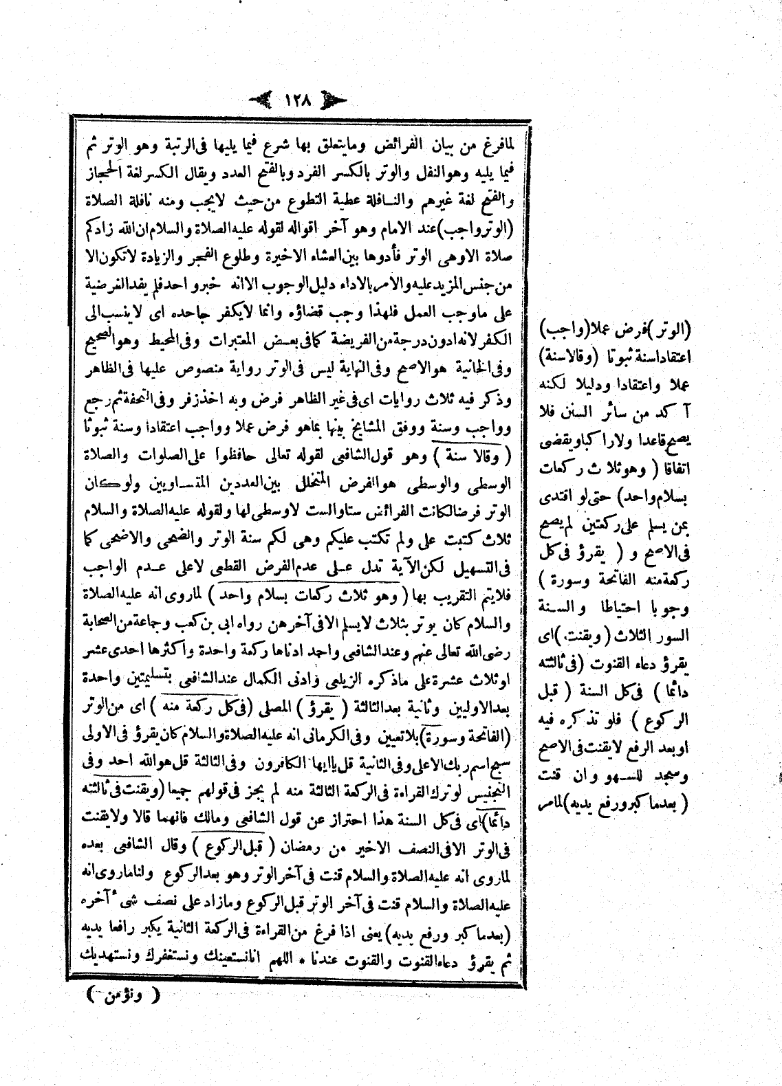 لَمَّا فَرَغَ مِنْ بَيَانِ الْفَرَائِضِ وَمَا يَتَعَلَّقُ بِهَا شَرَعَ فِيمَا يَلِيهَا فِي الرُّتْبَةِ وَهُوَ الْوِتْرُ ثُمَّ فِيمَا يَلِيهِ وَهُوَ النَّفَلُ وَالْوِتْرُ بِالْكَسْرِ الْفَرْدُ وَبِالْفَتْحِ الْعَدَدُ وَيُقَالُ الْكَسْرُ لُغَةُ الْحِجَازِ وَالْفَتْحُ لُغَةُ غَيْرِهِمْ وَالنَّافِلَةُ عَطِيَّةُ التَّطَوُّعِ مِنْ حَيْثُ لَا يَجِبُ وَمِنْهُ نَافِلَةُ الصَّلَاةِ (الْوِتْرُ وَاجِبٌ) عِنْدَ الْإِمَامِ وَهُوَ آخِرُ أَقْوَالِهِ لِقَوْلِهِ - عَلَيْهِ الصَّلَاةُ وَالسَّلَامُ - «أَنَّ اللَّهَ زَادَكُمْ صَلَاةً أَلَا وَهِيَ الْوِتْرُ فَأَدُّوهَا بَيْنَ الْعِشَاءِ الْأَخِيرَةِ وَطُلُوعِ الْفَجْرِ» وَالزِّيَادَةُ لَا تَكُونُ إلَّا مِنْ جِنْسِ الْمَزِيدِ عَلَيْهِ وَالْأَمْرُ بِالْأَدَاءِ دَلِيلُ الْوُجُوبِ إلَّا أَنَّهُ خَبَرٌ وَاحِدٌ فَلَمْ يَفْدِ الْفَرْضِيَّةَ عَلَى مَا وَجَبَ الْعَمَلُ فَلِهَذَا وَجَبَ قَضَاؤُهُ وَإِنَّمَا لَا يَكْفُرُ جَاحِدُهُ أَيْ لَا يُنْسَبُ إلَى الْكُفْرِ لِأَنَّهُ أَدْوَنُ دَرَجَةً مِنْ الْفَرِيضَةِ كَمَا فِي بَعْضِ الْمُعْتَبَرَاتِ.