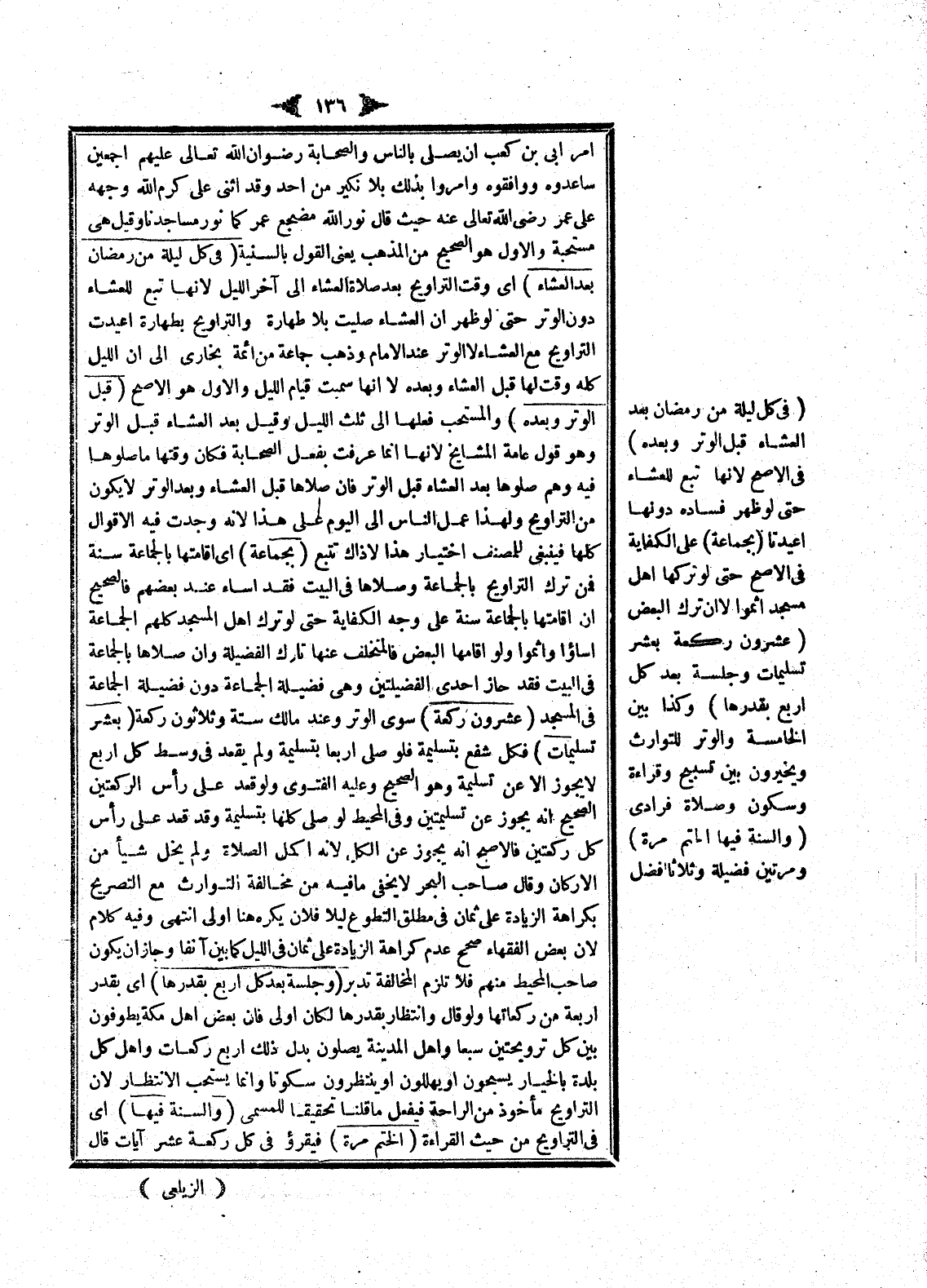 أَمَرَ أُبَيّ بْنَ كَعْبٍ أَنْ يُصَلِّيَ بِالنَّاسِ وَالصَّحَابَةُ - رِضْوَانُ اللَّهِ تَعَالَى عَلَيْهِمْ أَجْمَعِينَ - سَاعَدُوهُ وَوَافَقُوهُ وَأَمَرُوا بِذَلِكَ بِلَا نَكِيرٍ مِنْ أَحَدٍ وَقَدْ أَثْنَى عَلِيٌّ كَرَّمَ اللَّهُ وَجْهَهُ عَلَى عُمَرَ - رَضِيَ اللَّهُ تَعَالَى عَنْهُ - حَيْثُ قَالَ: نَوَّرَ اللَّهُ مَضْجَعَ عُمَرَ كَمَا نَوَّرَ مَسَاجِدَنَا وَقِيلَ: هِيَ مُسْتَحَبَّةٌ وَالْأَوَّلُ هُوَ الصَّحِيحُ مِنْ الْمَذْهَبِ يَعْنِي الْقَوْلَ بِالسُّنِّيَّةِ.