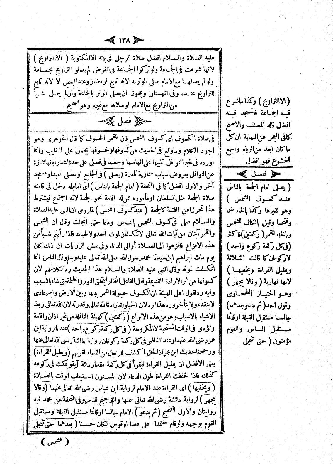 فِي صَلَاةِ الْكُسُوفِ أَيْ كُسُوفِ الشَّمْسِ فَإِنَّ لِلْقَمَرِ الْخُسُوفَ كَمَا قَالَ الْجَوْهَرِيُّ وَهُوَ أَجْوَدُ الْكَلَامِ وَمَا وَقَعَ فِي الْحَدِيثِ مِنْ كُسُوفِهَا وَخُسُوفِهَا يُحْمَلُ عَلَى التَّغْلِيبِ وَإِنَّمَا أَوْرَدَهُ فِي خَبَرِ النَّوَافِلِ تَنْبِيهًا عَلَى أَنَّهَا مِنْهَا وَجَعَلَهَا فِي فَصْلٍ عَلَى حِدَةٍ إشْعَارًا بِأَنَّهَا مُمْتَازَةٌ عَنْ النَّوَافِلِ بِعُرُوضِ أَسْبَابٍ سَمَاوِيَّةٍ نَادِرَةٍ (يُصَلِّي) فِي الْجَامِعِ أَوْ مُصَلَّى الْعِيدِ أَوْ مَسْجِدٍ آخَرَ وَالْأَوَّلُ أَفْضَلُ كَمَا فِي التُّحْفَةِ (أَمَامُ الْجُمُعَةِ بِالنَّاسِ) أَيْ إمَامٌ لَهُ دَخْلٌ فِي إقَامَتِهِ صَلَاةَ الْجُمُعَةِ مِثْلُ السُّلْطَانِ أَوْ مَأْمُورِهِ مِمَّنْ لَهُ إقَامَةٌ نَحْوُ الْجُمُعَةِ لِأَنَّهُ اجْتِمَاعٌ فَيُشْتَرَطُ هَذَا تَحَرُّزًا عَنْ الْفِتْنَةِ كَالْجُمُعَةِ (عِنْدَ كُسُوفِ الشَّمْسِ) لِمَا رُوِيَ «أَنَّ النَّبِيَّ - عَلَيْهِ الصَّلَاةُ وَالسَّلَامُ - صَلَّى فِي كُسُوفِ الشَّمْسِ بِالنَّاسِ وَدَعَا حَتَّى انْجَلَتْ وَقَالَ: إنَّ الشَّمْسَ وَالْقَمَرَ آيَتَانِ مِنْ آيَاتِ اللَّهِ تَعَالَى لَا تَنْكَسِفَانِ لِمَوْتِ أَحَدٍ وَلَا لِحَيَاتِهِ فَإِذَا رَأَيْتُمْ شَيْئًا مِنْ هَذِهِ الْأَفْزَاعِ فَافْزَعُوا إلَى الصَّلَاةِ أَوْ إلَى الدُّعَاءِ» .