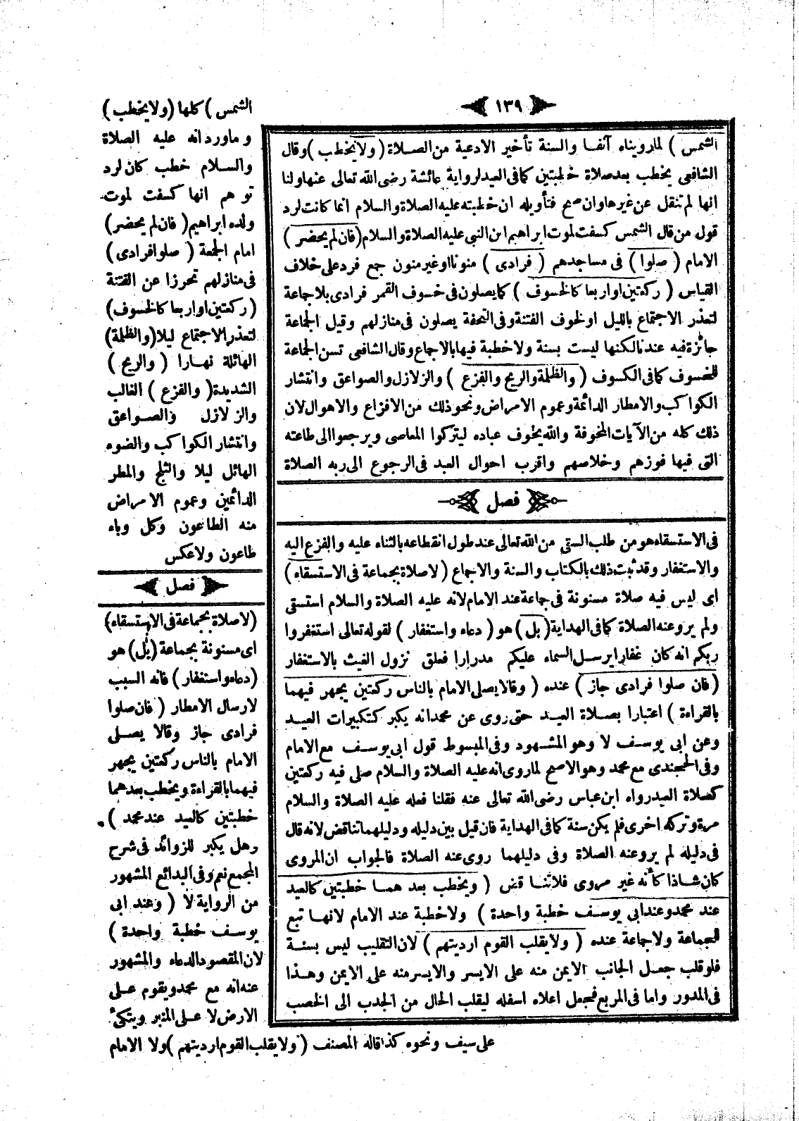 فِي الِاسْتِسْقَاءِ هُوَ مِنْ طَلَبِ السَّقْيِ مِنْ اللَّهِ تَعَالَى عِنْدَ طُولِ انْقِطَاعِهِ بِالثَّنَاءِ عَلَيْهِ وَالْفَزَعِ إلَيْهِ وَالِاسْتِغْفَارِ وَقَدْ ثَبَتَ ذَلِكَ بِالْكِتَابِ وَالسُّنَّةِ وَالْإِجْمَاعِ (لَا صَلَاةَ بِجَمَاعَةٍ فِي الِاسْتِسْقَاءِ) أَيْ لَيْسَ فِيهِ صَلَاةٌ مَسْنُونَةٌ فِي جَمَاعَةٍ عِنْدَ الْإِمَامِ لِأَنَّهُ - عَلَيْهِ الصَّلَاةُ وَالسَّلَامُ - اسْتَسْقَى وَلَمْ يُرْوَ عَنْهُ الصَّلَاةُ كَمَا فِي الْهِدَايَةِ (بَلْ) هُوَ (دُعَاءٌ وَاسْتِغْفَارٌ) لِقَوْلِهِ تَعَالَى {اسْتَغْفِرُوا رَبَّكُمْ إِنَّهُ كَانَ غَفَّارًا} [نوح: 10] {يُرْسِلِ السَّمَاءَ عَلَيْكُمْ مِدْرَارًا} [نوح: 11] فَعَلَّقَ نُزُولَ الْغَيْثِ بِالِاسْتِغْفَارِ (فَإِنْ صَلَّوْا فُرَادَى جَازَ) عِنْدَهُ.