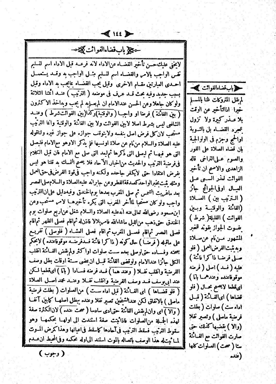 لَا يَخْفَى عَلَيْك حُسْنُ تَأْخِيرِ الْقَضَاءِ عَنْ الْأَدَاءِ لِأَنَّهُ فَرْعُهُ قِيلَ: الْأَدَاءُ اسْمٌ لِتَسْلِيمِ نَفْسِ الْوَاجِبِ بِالْأَمْرِ وَالْقَضَاءُ اسْمٌ لِتَسْلِيمِ مِثْلِ الْوَاجِبِ بِهِ وَقَدْ يَسْتَعْمِلُ إحْدَى الْعِبَارَتَيْنِ مَقَامَ الْأُخْرَى وَقِيلَ: يَجِبُ الْقَضَاءُ بِمَا يَجِبُ بِهِ الْأَدَاءُ وَقِيلَ بِسَبَبٍ جَدِيدٍ وَفِيهِ بَحْثٌ قَدْ عُرِفَ فِي مَوْضِعِهِ (التَّرْتِيبُ) عِنْدَ أَئِمَّتِنَا الثَّلَاثَةِ وَلَوْ كَانَ جَاهِلًا وَعَنْ الْحَسَنِ عِنْدَ الْإِمَامِ إنْ لَمْ يَعْلَمْ بِهِ لَمْ يَجِبْ وَبِهِ أَخَذَ الْأَكْثَرُونَ (بَيْنَ الْفَائِتَةِ) فَرْضًا أَوْ وَاجِبًا.