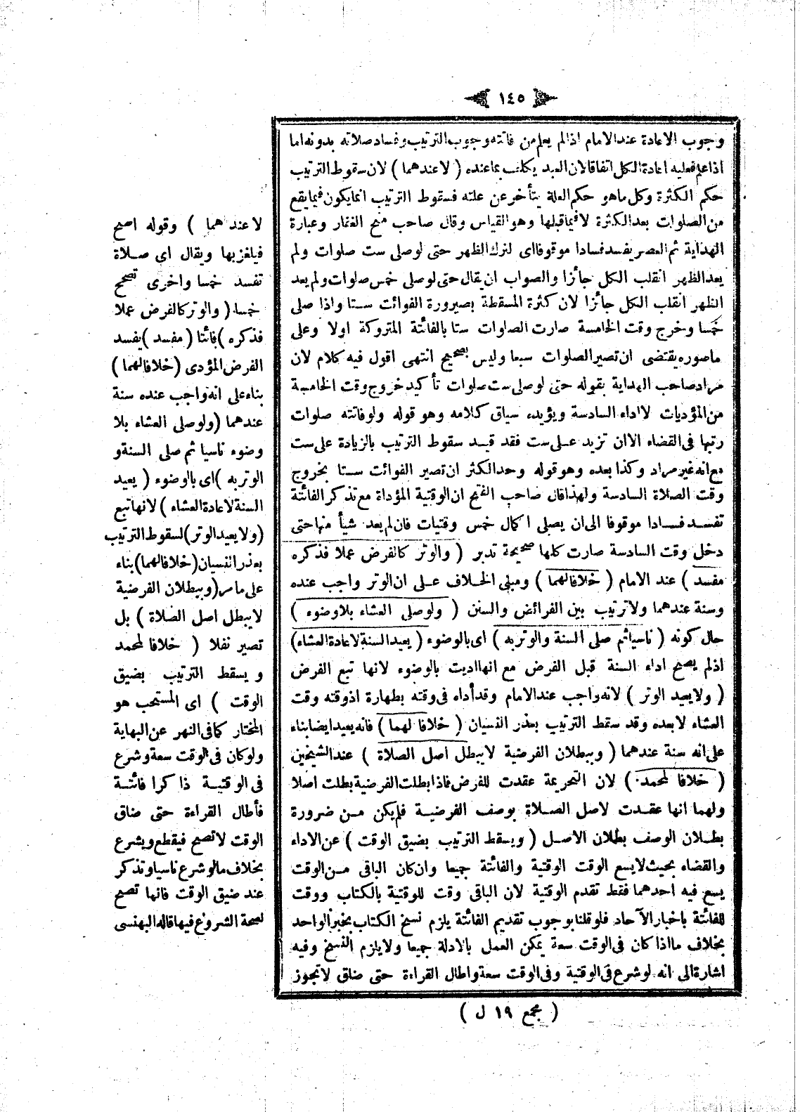 وُجُوبِ الْإِعَادَةِ عِنْدَ الْإِمَامِ إذَا لَمْ يَعْلَمْ مَنْ فَاتَتْهُ وُجُوبَ التَّرْتِيبِ وَفَسَادَ صَلَاتِهِ بِدُونِهِ أَمَّا إذَا عَلِمَ فَعَلَيْهِ إعَادَةُ الْكُلِّ اتِّفَاقًا لِأَنَّ الْعَبْدَ يُكَلَّفُ بِمَا عِنْدَهُ (لَا عِنْدَهُمَا) لِأَنَّ سُقُوطَ التَّرْتِيبِ حُكْمُ الْكَثْرَةِ وَكُلُّ مَا هُوَ حُكْمُ الْعِلَّةِ يَتَأَخَّرُ عَنْ عِلَّتِهِ فَسُقُوطُ التَّرْتِيبِ إنَّمَا يَكُونُ فِيمَا يَقَعُ مِنْ الصَّلَوَاتِ بَعْدَ الْكَثْرَةِ لَا فِيمَا قَبْلَهَا وَهُوَ الْقِيَاسُ.