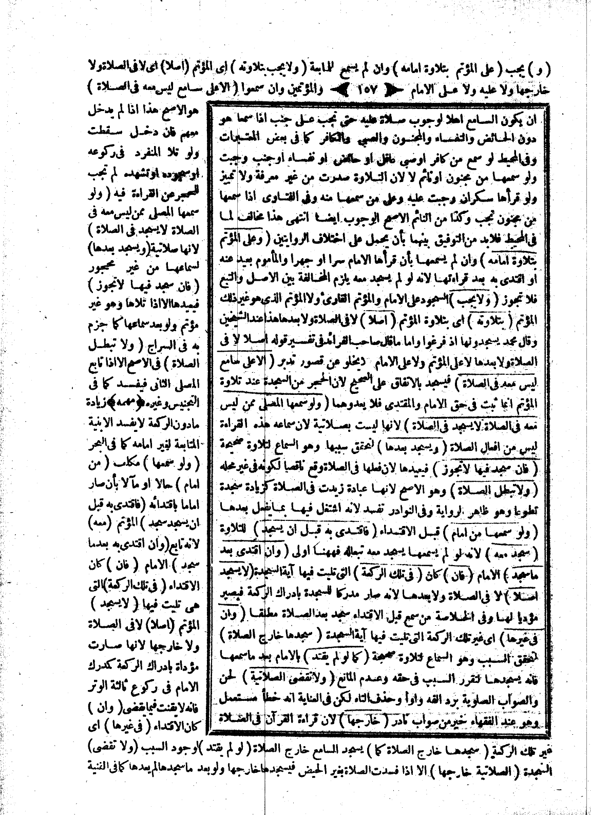 (وَلَا يَجِبُ) السُّجُودُ عَلَى الْإِمَامِ وَالْمُؤْتَمِّ الْقَارِئِ وَلَا الْمُؤْتَمِّ الَّذِي هُوَ غَيْرُ ذَلِكَ الْمُؤْتَمِّ (بِتِلَاوَتِهِ) أَيْ بِتِلَاوَةِ الْمُؤْتَمِّ (أَصْلًا) لَا فِي الصَّلَاةِ وَلَا بَعْدَهَا هَذَا عِنْدَ الشَّيْخَيْنِ.