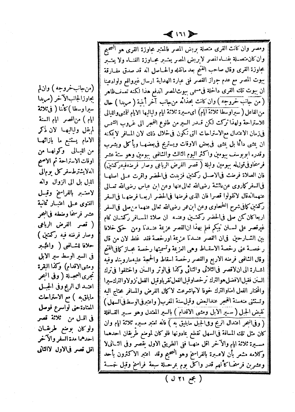 وَقَالَ صَاحِبُ الْفَتْحِ بَعْدَمَا نَقَلَهُ: وَالْحَاصِلُ أَنَّهُ قَدْ صَدَّقَ مُفَارَقَةَ بُيُوتِ الْمِصْرِ مَعَ عَدَمِ جَوَازِ الْقَصْرِ فَفِي عِبَارَةِ الْهِدَايَةِ إرْسَالٌ غَيْرُ وَاقِعٍ وَلَوْ ادَّعَيْنَا أَنَّ بُيُوتَ تِلْكَ الْقُرَى دَاخِلَةٌ فِي مُسَمًّى بُيُوتِ الْمِصْرِ انْدَفَعَ هَذَا لَكِنَّهُ تَعَسُّفٌ ظَاهِرٌ (مِنْ جَانِبِ خُرُوجِهِ) وَإِنْ كَانَتْ بِحِذَائِهِ مِنْ جَانِبِ آخِرِ أَبْنِيَةٍ (مُرِيدًا) حَالٌ مِنْ الْفَاعِلِ (سَيْرًا وَسَطًا ثَلَاثَةَ أَيَّامٍ) أَيْ مَسِيرَةَ ثَلَاثَةِ أَيَّامٍ وَلَيَالِيهَا الْأَيَّامُ لِلْمَشْيِ وَاللَّيَالِي لِلِاسْتِرَاحَةِ وَلِهَذَا تَرَكْت لَكِنَّ قَدْرَ السَّيْرِ مِنْ طُلُوعِ الْفَجْرِ إلَى غُرُوبِ الشَّمْسِ فِي زَمَانِ الِاعْتِدَالِ مَعَ الِاسْتِرَاحَاتِ الَّتِي تَكُونُ فِي خِلَالِ ذَلِكَ لِأَنَّ الْمُسَافِرَ لَا يُمْكِنُهُ أَنْ يَمْشِيَ دَائِمًا بَلْ يَمْشِي فِي بَعْضِ الْأَوْقَاتِ وَيَسْتَرِيحُ فِي بَعْضِهَا وَيَأْكُلُ وَيَشْرَبُ وَقَدَّرَهُ أَبُو يُوسُفَ بِيَوْمَيْنِ وَأَكْثَرِ الْيَوْمِ الثَّالِثِ وَالشَّافِعِيُّ بِيَوْمَيْنِ وَهُوَ سِتَّةَ عَشَرَ فَرْسَخًا وَفِي قَوْلِهِ لَهُ بِيَوْمَيْنِ وَلَيْلَةٍ (قَصَرَ الْفَرْضَ الرُّبَاعِيَّ وَصَارَ فَرْضُهُ فِيهِ رَكْعَتَيْنِ) فَإِنَّ الصَّلَاةَ فُرِضَتْ فِي الْأَصْلِ رَكْعَتَيْنِ فَزِيدَتْ فِي الْحَضَرِ وَأُقِرَّتْ عَلَى أَصْلِهَا فِي السَّفَرِ كَمَا رُوِيَ عَنْ عَائِشَةَ - رَضِيَ اللَّهُ تَعَالَى عَنْهَا - وَعَنْ ابْنِ عَبَّاسٍ - رَضِيَ اللَّهُ تَعَالَى عَنْهُمَا - أَنَّهُ قَالَ: لَا تَقُولُوا قَصْرًا فَإِنَّ الَّذِي فَرْضُهَا فِي الْحَضَرِ أَرْبَعًا فَرْضُهَا فِي السَّفَرِ رَكْعَتَيْنِ كَمَا فِي شَرْحِ الطَّحَاوِيِّ وَعَنْ ابْنِ عُمَرَ - رَضِيَ اللَّهُ تَعَالَى عَنْهُمَا - مَنْ صَلَّى فِي السَّفَرِ أَرْبَعًا كَانَ كَمَنْ صَلَّى فِي الْحَضَرِ رَكْعَتَيْنِ وَعَنْهُ أَنَّ «صَلَاةَ الْمُسَافِرِ رَكْعَتَانِ تَمَامٌ غَيْرُ قَصْرٍ عَلَى لِسَانِ نَبِيِّكُمْ» فَعُلِمَ بِهَذَا أَنَّ الْقَصْرَ عَزِيمَةٌ عِنْدَنَا وَمَنْ حَكَى خِلَافًا بَيْنَ الشَّارِحِينَ فِي أَنَّ الْقَصْرَ عِنْدَنَا عَزِيمَةٌ أَوْ رُخْصَةٌ فَقَدْ غَلِطَ لِأَنَّ مَنْ قَالَ: رُخْصَةٌ عَنَى رُخْصَةَ الْإِسْقَاطِ وَهِيَ الْعَزِيمَةُ وَتَسْمِيَتُهَا رُخْصَةً مَجَازٌ كَمَا فِي الْفَتْحِ.