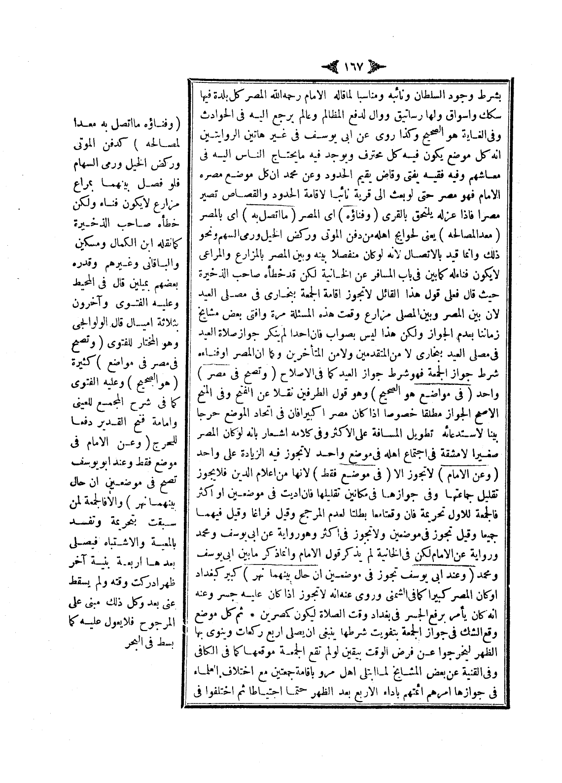 وَفِي الْغَايَةِ هُوَ الصَّحِيحُ وَكَذَا رُوِيَ عَنْ أَبِي يُوسُفَ فِي غَيْرِ هَاتَيْنِ الرِّوَايَتَيْنِ أَنَّهُ كُلُّ مَوْضِعٍ لَا يَكُونُ فِيهِ كُلُّ مُحْتَرَفٍ وَيُوجَدُ فِيهِ مَا يَحْتَاجُ النَّاسُ إلَيْهِ فِي مَعَاشِهِمْ وَفِيهِ فَقِيهٌ يُفْتِي وَقَاضٍ يُقِيمُ الْحُدُودَ وَعَنْ مُحَمَّدٍ أَنَّ كُلَّ مَوْضِعٍ مَصَّرَهُ الْإِمَامُ فَهُوَ مِصْرٌ حَتَّى لَوْ بَعَثَ إلَى قَرْيَةٍ نَائِبًا لِإِقَامَةِ الْحُدُودِ وَالْقِصَاصِ تَصِيرُ مِصْرًا فَإِذَا عَزَلَهُ يَلْتَحِقُ بِالْقُرَى (وَفِنَاؤُهُ) أَيْ الْمِصْرِ (مَا اتَّصَلَ بِهِ) أَيْ بِالْمِصْرِ (مُعَدًّا لِمَصَالِحِهِ) يَعْنِي لِحَوَائِجِ أَهْلِهِ مِنْ دَفْنِ الْمَوْتَى وَرَكْضِ الْخَيْلِ وَرَمْيِ السَّهْمِ وَنَحْوِ ذَلِكَ وَإِنَّمَا قَيَّدَ بِالِاتِّصَالِ لِأَنَّهُ لَوْ كَانَ مُنْفَصِلًا بَيْنَهُ وَبَيْنَ الْمِصْرِ بِالْمَزَارِعِ وَالْمَرَاعِي لَا يَكُونُ فِنَاءً لَهُ كَمَا بَيَّنَ فِي بَابِ الْمُسَافِرِ عَنْ الْخَانِيَّةِ لَكِنْ قَدْ خَطَّأَهُ صَاحِبُ الذَّخِيرَةِ حَيْثُ قَالَ: فَعَلَى قَوْلِ هَذَا الْقَائِلِ لَا تَجُوزُ إقَامَةُ الْجُمُعَةِ بِبُخَارَى فِي مُصَلَّى الْعِيدِ لِأَنَّ بَيْنَ الْمِصْرِ وَبَيْنَ الْمُصَلَّى مَزَارِعَ وَقَعَتْ هَذِهِ الْمَسْأَلَةُ مَرَّةً وَأَفْتَى بَعْضُ مَشَايِخِ زَمَانِنَا بِعَدَمِ الْجَوَازِ وَلَكِنَّ هَذَا لَيْسَ بِصَوَابٍ فَإِنَّ أَحَدًا لَمْ يُنْكِرْ جَوَازَ صَلَاةِ الْعِيدِ فِي مُصَلَّى الْعِيدِ بِبُخَارَى لَا مِنْ الْمُتَقَدِّمِينَ وَلَا مِنْ الْمُتَأَخِّرِينَ وَكَمَا أَنَّ الْمِصْرَ أَوْ فِنَاءَهُ شَرْطُ جَوَازِ الْجُمُعَةِ فَهُوَ شَرْطُ جَوَازِ الْعِيدِ كَمَا فِي الْإِصْلَاحِ.