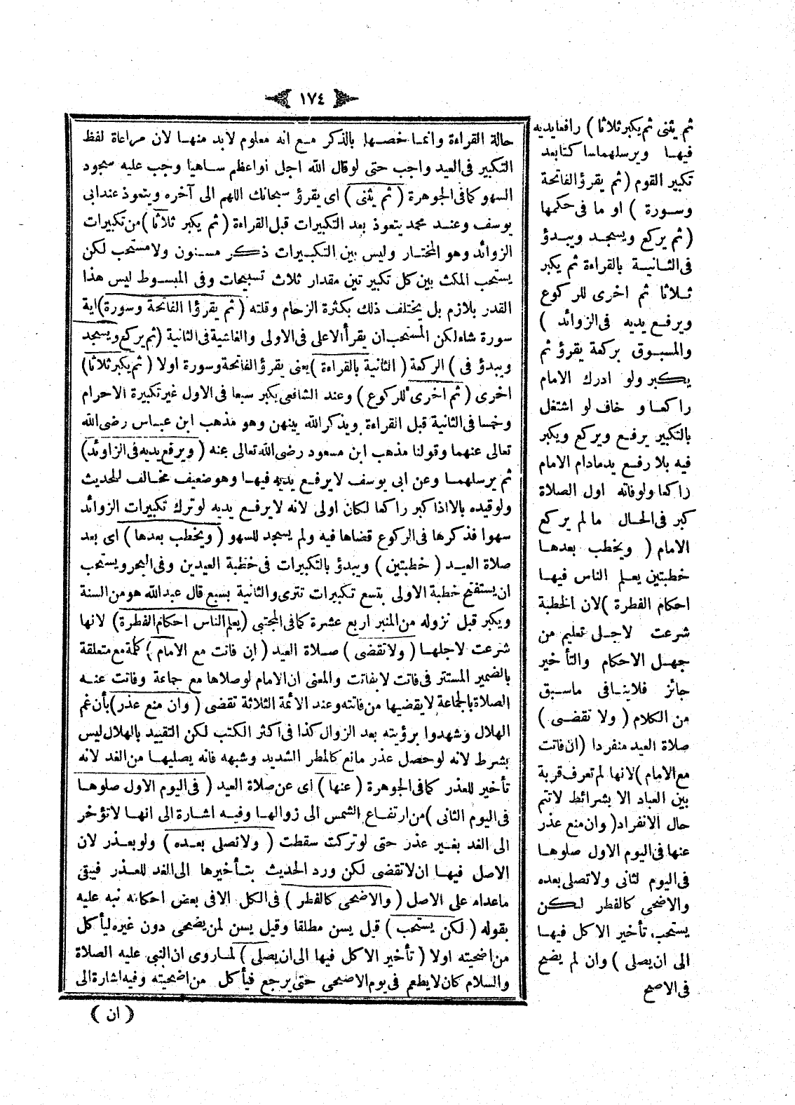 حَالَةِ الْقِرَاءَةِ وَإِنَّمَا خَصَّهَا بِالذِّكْرِ مَعَ أَنَّهُ مَعْلُومٌ لَا بُدَّ مِنْهَا لِأَنَّ مُرَاعَاةَ لَفْظِ التَّكْبِيرِ فِي الْعِيدِ وَاجِبٌ حَتَّى لَوْ قَالَ اللَّهُ أَجَلُّ أَوْ أَعْظَمُ سَاهِيًا وَجَبَ عَلَيْهِ سُجُودُ السَّهْوِ كَمَا فِي الْجَوْهَرَةِ (ثُمَّ يُثْنِي) أَيْ يَقْرَأُ سُبْحَانَك اللَّهُمَّ إلَى آخِرِهِ وَيَتَعَوَّذُ عِنْدَ أَبِي يُوسُفَ وَعِنْدَ مُحَمَّدٍ يَتَعَوَّذُ بَعْدَ التَّكْبِيرَاتِ قَبْلَ الْقِرَاءَةِ (ثُمَّ يُكَبِّرُ ثَلَاثًا) مِنْ تَكْبِيرَاتِ الزَّوَائِدِ وَهُوَ الْمُخْتَارُ وَلَيْسَ بَيْنَ التَّكْبِيرَاتِ ذِكْرٌ مَسْنُونٌ وَلَا مُسْتَحَبٌّ لَكِنْ يُسْتَحَبُّ الْمُكْثُ بَيْنَ كُلِّ تَكْبِيرَتَيْنِ مِقْدَارَ ثَلَاثِ تَسْبِيحَاتٍ.