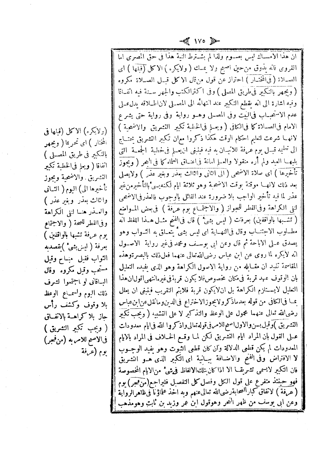 وَفِي الْفَتْحِ وَالْإِضَافَةُ بَيَانِيَّةٌ أَيْ التَّكْبِيرُ الَّذِي هُوَ التَّشْرِيقُ فَإِنَّ التَّكْبِيرَ لَا يُسَمَّى تَشْرِيقًا إلَّا إذَا كَانَ بِتِلْكَ الْأَلْفَاظِ فِي شَيْءٍ مِنْ الْأَيَّامِ الْمَخْصُوصَةِ فَهُوَ حِينَئِذٍ مُتَفَرِّعٌ عَلَى قَوْلِ الْكُلِّ وَفُصِّلَ كُلَّ التَّفْصِيلِ فَلْيُرَاجَعْ (مِنْ فَجْرِ) يَوْمِ (عَرَفَةَ) لِاتِّفَاقِ كِبَارِ الصَّحَابَةِ - رَضِيَ اللَّهُ تَعَالَى عَنْهُمْ - وَبِهِ أَخَذَ عُلَمَاؤُنَا فِي ظَاهِرِ الرِّوَايَةِ وَعَنْ أَبِي يُوسُفَ مِنْ ظُهْرِ النَّحْرِ وَهُوَ قَوْلُ ابْنِ عُمَرَ وَزَيْدِ بْنِ ثَابِتٍ وَهُوَ مَذْهَبُ