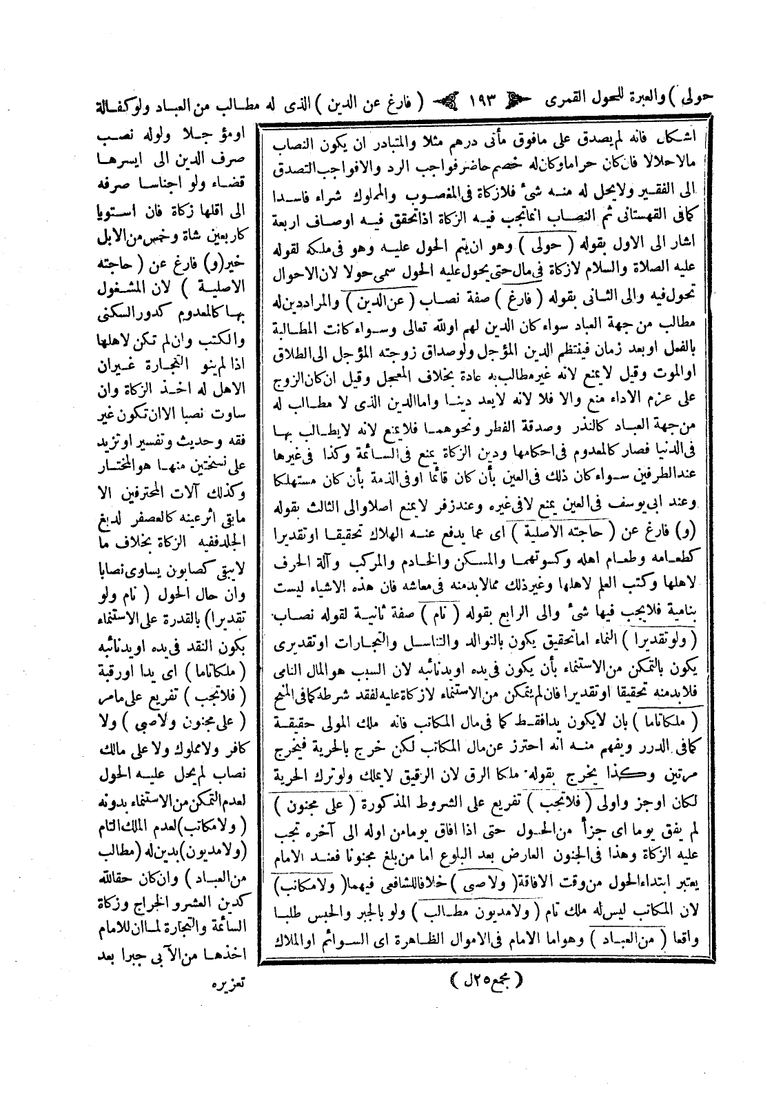 إشْكَالٌ فَإِنَّهُ لَمْ يُصَدِّقْ عَلَى مَا فَوْقَ مِائَتَيْ دِرْهَمٍ مَثَلًا وَالْمُتَبَادِرُ أَنْ يَكُونَ النِّصَابُ مَالًا حَلَالًا فَإِنْ كَانَ حَرَامًا وَكَانَ لَهُ خَصْمٌ حَاضِرٌ فَوَاجِبُ الرَّدِّ وَإِلَّا فَوَاجِبُ التَّصَدُّقِ إلَى الْفَقِيرِ وَلَا يَحِلُّ لَهُ مِنْهُ شَيْءٌ فَلَا زَكَاةَ فِي الْمَغْصُوبِ وَالْمَمْلُوكِ شِرَاءً فَاسِدًا كَمَا فِي الْقُهُسْتَانِيِّ ثُمَّ النِّصَابُ إنَّمَا تَجِبُ فِيهِ الزَّكَاةُ إذَا تَحَقَّقَ فِيهِ أَوْصَافٌ أَرْبَعَةٌ أَشَارَ إلَى الْأَوَّلِ بِقَوْلِهِ (حَوْلِيٍّ) وَهُوَ أَنْ يَتِمَّ الْحَوْلُ عَلَيْهِ وَهُوَ فِي مِلْكِهِ لِقَوْلِهِ - عَلَيْهِ الصَّلَاةُ وَالسَّلَامُ - «لَا زَكَاةَ فِي مَالٍ حَتَّى يَحُولَ عَلَيْهِ الْحَوْلُ» سُمِّيَ حَوْلًا لِأَنَّ الْأَحْوَالَ تُحَوَّلُ فِيهِ وَإِلَى الثَّانِي بِقَوْلِهِ (فَارِغٍ) صِفَةُ نِصَابٍ (عَنْ الدَّيْنِ) وَالْمُرَادُ دَيْنٌ لَهُ مُطَالَبٌ مِنْ جِهَةِ الْعِبَادِ سَوَاءٌ كَانَ الدَّيْنُ لَهُمْ أَوْ لِلَّهِ تَعَالَى وَسَوَاءٌ كَانَتْ الْمُطَالَبَةُ بِالْفِعْلِ أَوْ بَعْدَ زَمَانٍ فَيَنْتَظِمُ الدَّيْنُ الْمُؤَجَّلُ وَلَوْ صَدَاقَ زَوْجَتِهِ الْمُؤَجَّلَ إلَى الطَّلَاقِ أَوْ الْمَوْتِ وَقِيلَ: لَا يُمْنَعُ لِأَنَّهُ غَيْرُ مُطَالَبٍ بِهِ عَادَةً بِخِلَافِ الْمُعَجَّلِ وَقِيلَ: إنْ كَانَ الزَّوْجُ عَلَى عَزْمِ الْأَدَاءِ مُنِعَ وَإِلَّا فَلَا لِأَنَّهُ يُعَدُّ دَيْنًا وَأَمَّا الدَّيْنُ الَّذِي لَا مُطَالِبَ لَهُ مِنْ جِهَةِ الْعِبَادِ كَالنَّذْرِ وَصَدَقَةِ الْفِطْرِ وَنَحْوِهِمَا فَلَا يُمْنَعُ لِأَنَّهُ لَا يُطَالَبُ بِهَا فِي الدُّنْيَا فَصَارَ كَالْمَعْدُومِ فِي أَحْكَامِهَا وَدَيْنُ الزَّكَاةِ يُمْنَعُ فِي السَّائِمَةِ وَكَذَا فِي غَيْرِهَا عِنْدَ الطَّرَفَيْنِ سَوَاءٌ كَانَ ذَلِكَ فِي الْعَيْنِ بِأَنْ كَانَ قَائِمًا أَوْ فِي الذِّمَّةِ بِأَنْ كَانَ مُسْتَهْلَكًا وَعِنْدَ أَبِي يُوسُفَ فِي الْعَيْنِ يُمْنَعُ لَا فِي غَيْرِهِ وَعِنْدَ زُفَرَ لَا يُمْنَعُ أَصْلًا وَإِلَى الثَّالِثِ بِقَوْلِهِ.